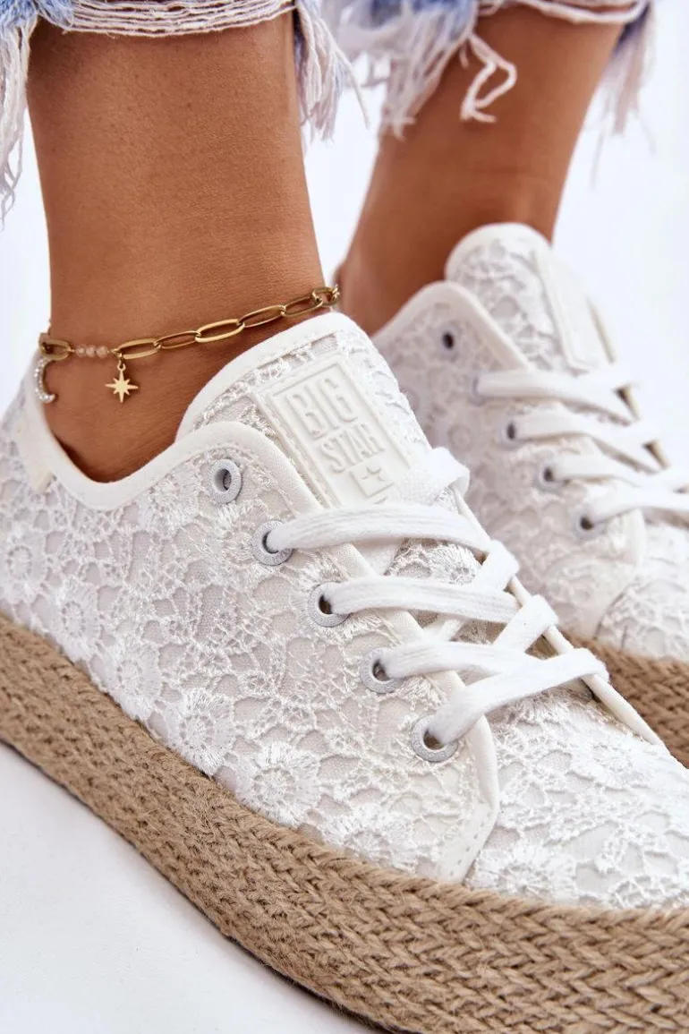 Damskie trampki polskiej marki Big Star zostały wykonane z materiału tekstylnego i dodatkowo ozdobione haftami. Buty te posiadają miękką, materiałową wkładkę oraz antypoślizgową podeszwę wykonaną z gumowego tworzywa. Trampki zostały osadzone na platformie ozdobionej jutowym warkoczem. Koniecznie sprawdź całą naszą kolekcję butów BIG STAR.Przy wyborze rozmiaru prosimy sugerować się tabelą rozmiarów.