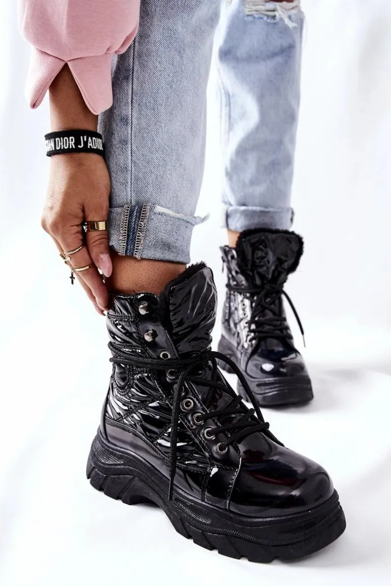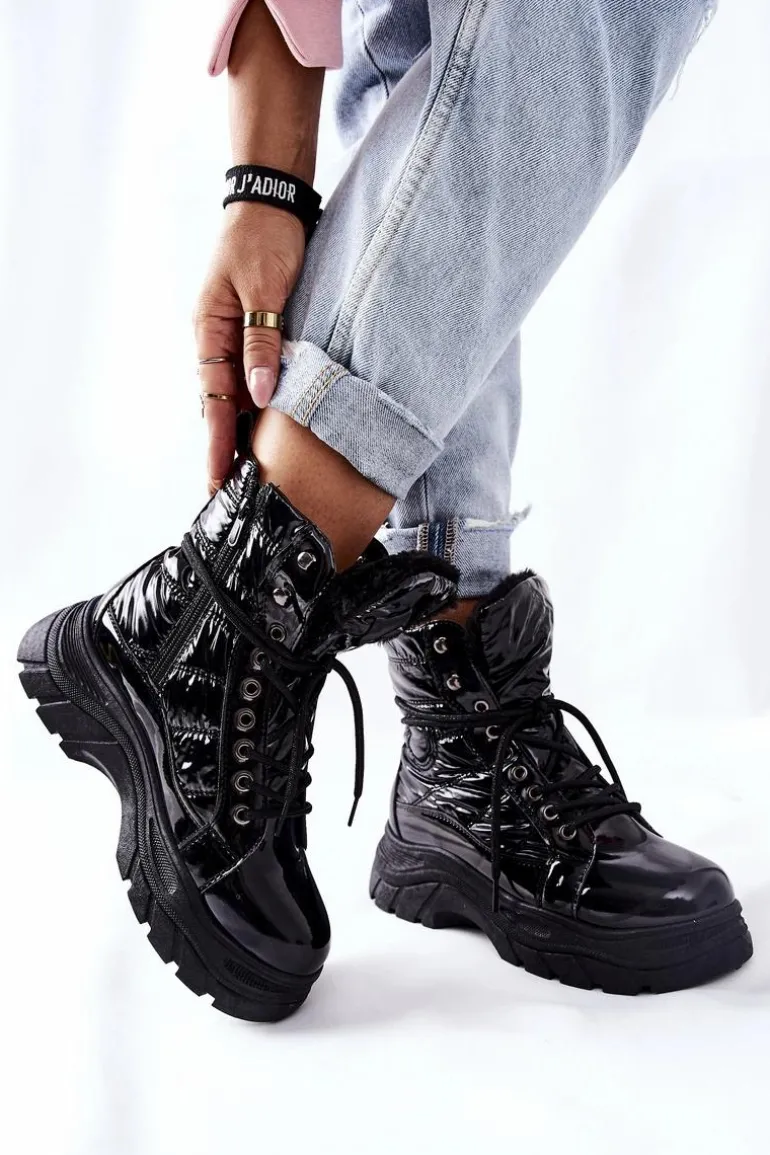 Damskie ocieplane botki wykonane ze skóry ekologicznej. Sznurowane oraz zapinane na zamek. Idealne na zimę.