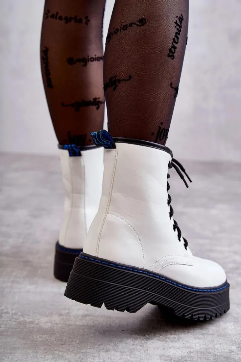 Wyjątkowe botki damskie posiadają klasyczne wiązanie na okrągłe sznurowadła oraz suwak ułatwiający zakładanie obuwia. Posiadają delikatne przeszycia na cholewce. Wykonane z eko skóry. Usztywniany zapiętek zapewni stabilizację stopy. Botki osadzono na płaskim, masywnym obcasie oraz platformie, która jest dodatkowo obszyta nicią. Przy wyborze rozmiaru prosimy sugerować się tabelą rozmiarów.