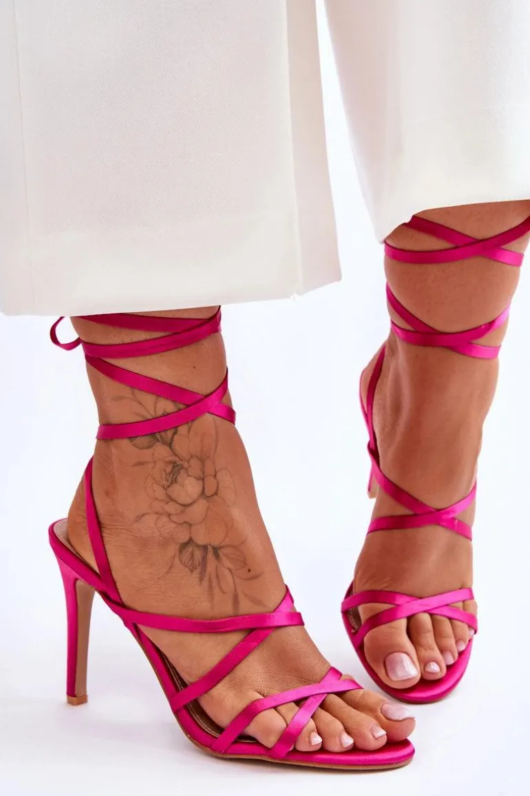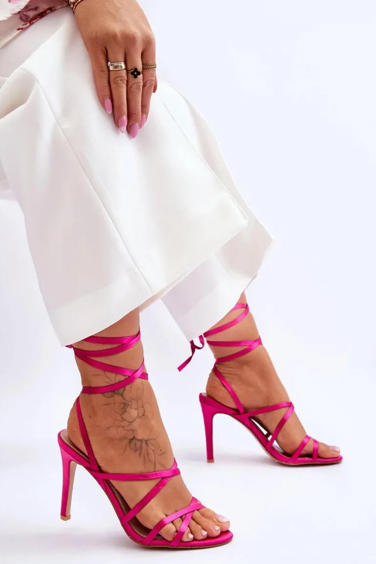 Klasyczne, damskie sandałki zostały wykonane z materiału tekstylnego. Osadzone na obcasie w postaci szpilki. Sandałki posiadają miękką, eko skórzaną wkładkę. Idealne na upalne dni, dzięki przewiewnemu fasonowi. Sandałki posiadają odkryty, lekko zaokrąglony nosek. Model ten jest wiązany wokół łydki. Przy wyborze rozmiaru prosimy sugerować się tabelą rozmiarów.