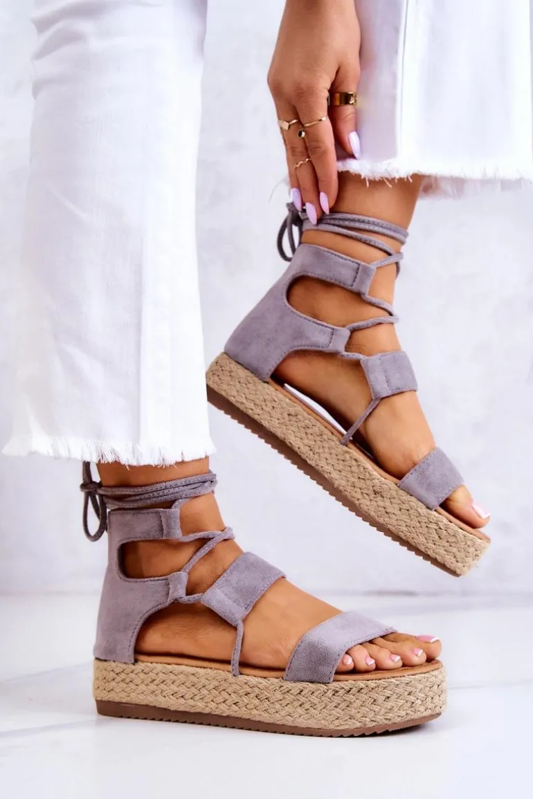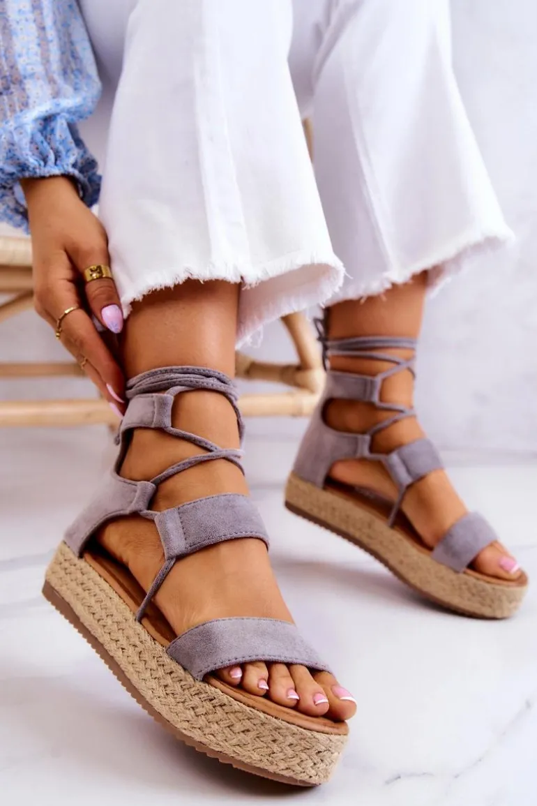 Świetne, wiązane sandały w stylu espadryli. Posiadają cholewkę za kostkę wykonaną z eko zamszu. Można je odpowiednio dopasować do tęgości nogi. Platforma jest ozdobiona jutową plecionką, natomiast podeszwa została wykonana z gumowego tworzywa i jest antypoślizgowa. Miękka wkładka wykonana z eko skóry zapewni wygodę podczas użytkowania. Idealne do pracy, na spotkanie ze znajomymi czy weekendowy wyjazd. Model, który sprawi, że Twoje stylizacje będą wyglądać niesamowicie! Przy wyborze rozmiaru prosimy sugerować się tabelą rozmiarów.