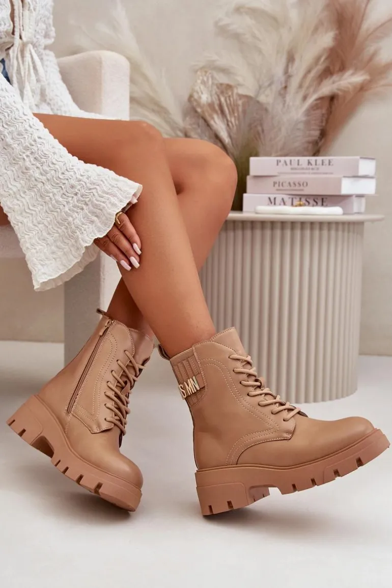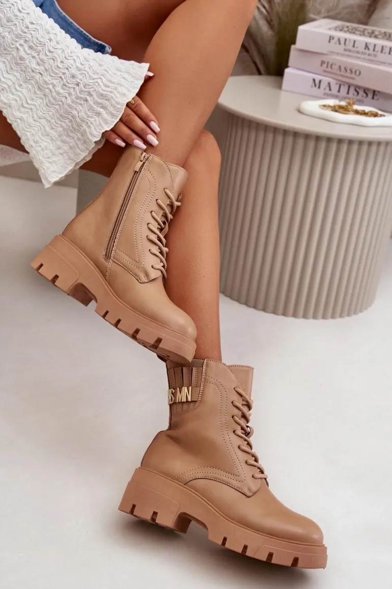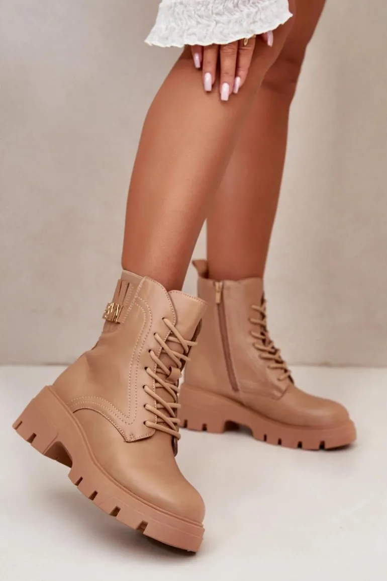 Botki damskie w kolorze beżowym, idealne na każdą porę roku. Wykonane z wysokiej jakości skóry ekologicznej, gwarantują trwałość i odporność na zmienne warunki pogodowe. Masywna, gumowa podeszwa z głębokim bieżnikiem zapewnia doskonałą przyczepność, co jest nieocenione podczas chodzenia po śliskich lub nierównych powierzchniach. Stylowe sznurowanie umożliwia idealne dopasowanie, a dodatkowy zamek błyskawiczny na boku ułatwia zakładanie i zdejmowanie butów. Eleganckie przeszycia dodają charakteru, a dyskretna, wytłaczana nazwa marki na górnej części cholewki podkreśla ekskluzywny charakter produktu. Te botki będą wyjątkowym dodatkiem do każdej stylizacji, od casualowych jeansów po bardziej formalne, miejskie outfity.Przy wyborze rozmiaru prosimy sugerować się tabelą rozmiarów.