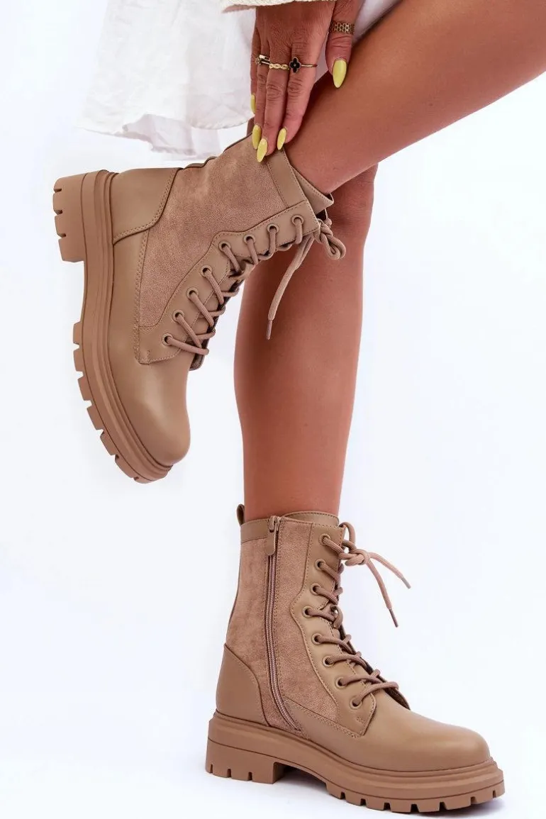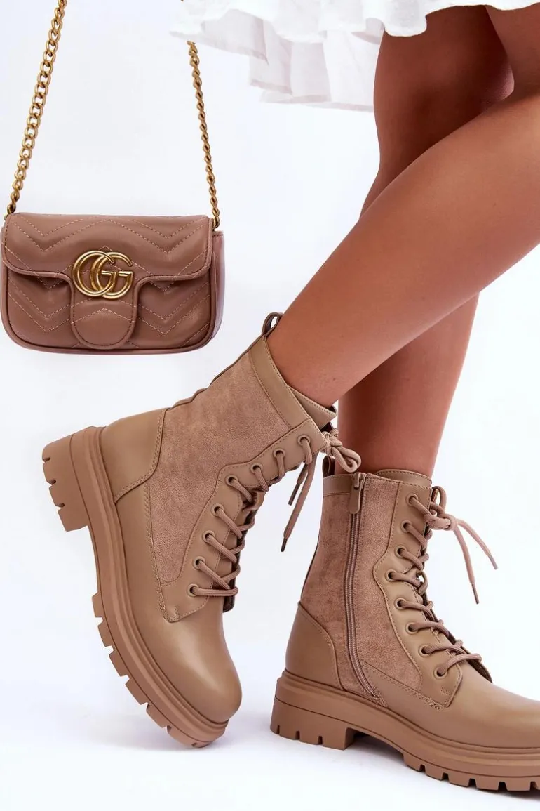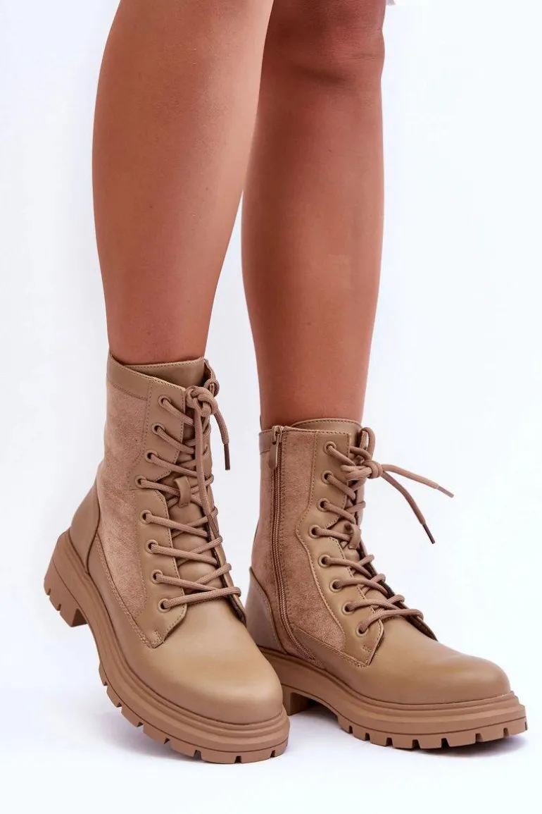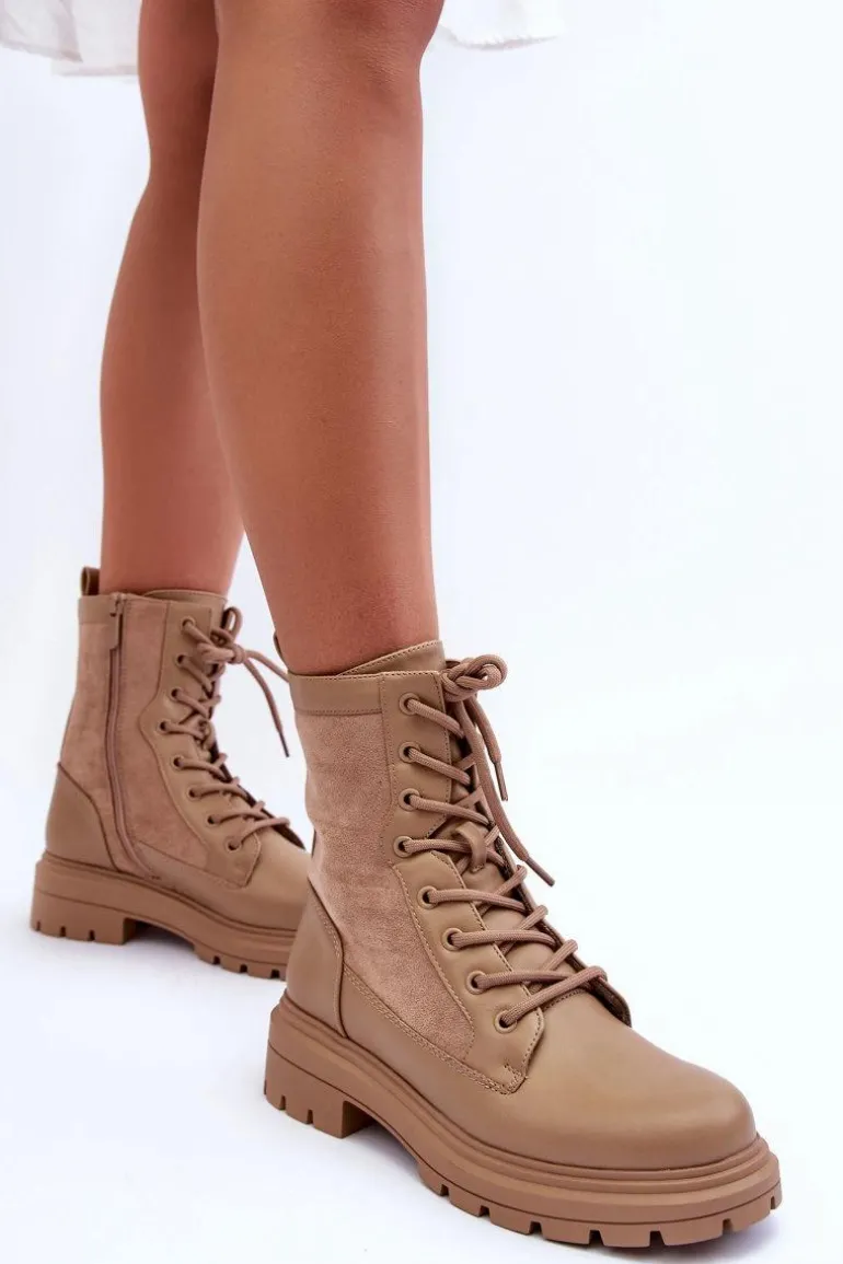 Klasyczne workery damskie wykonane z eko skóry. Osadzone na płaskim obcasie i platformie. Model ten zapinany jest na suwak z boku oraz posiada dodatkowe sznurowanie. Zapiętek w tym obuwiu jest usztywniany. Idealne do jesiennych i zimowych stylizacji! Przy wyborze rozmiaru prosimy sugerować się tabelą rozmiarów.
