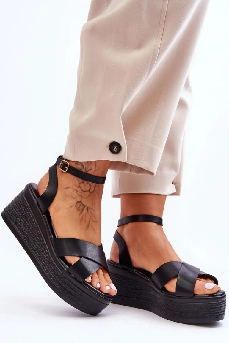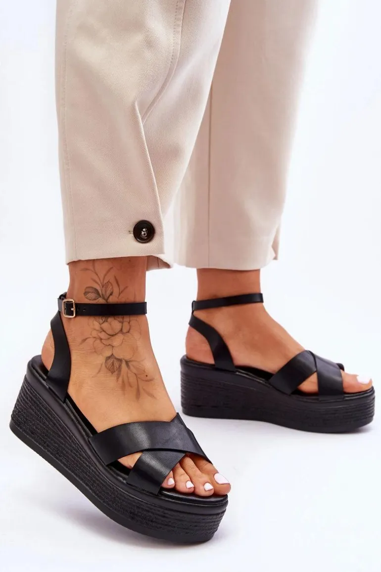 Klasyczne sandały damskie zostały osadzone na koturnie oraz platformie. Model ten posiada na przodzie dwa krzyżujące się paski. Miękka wkładka z eko skóry zapewni komfortowe użytkowanie obuwia. Sandałki posiadają platformę ozdobioną imitacją warkoczy. Zapinane na regulowany pasek ze sprzączką. Przy wyborze rozmiaru prosimy sugerować się tabelą rozmiarów.