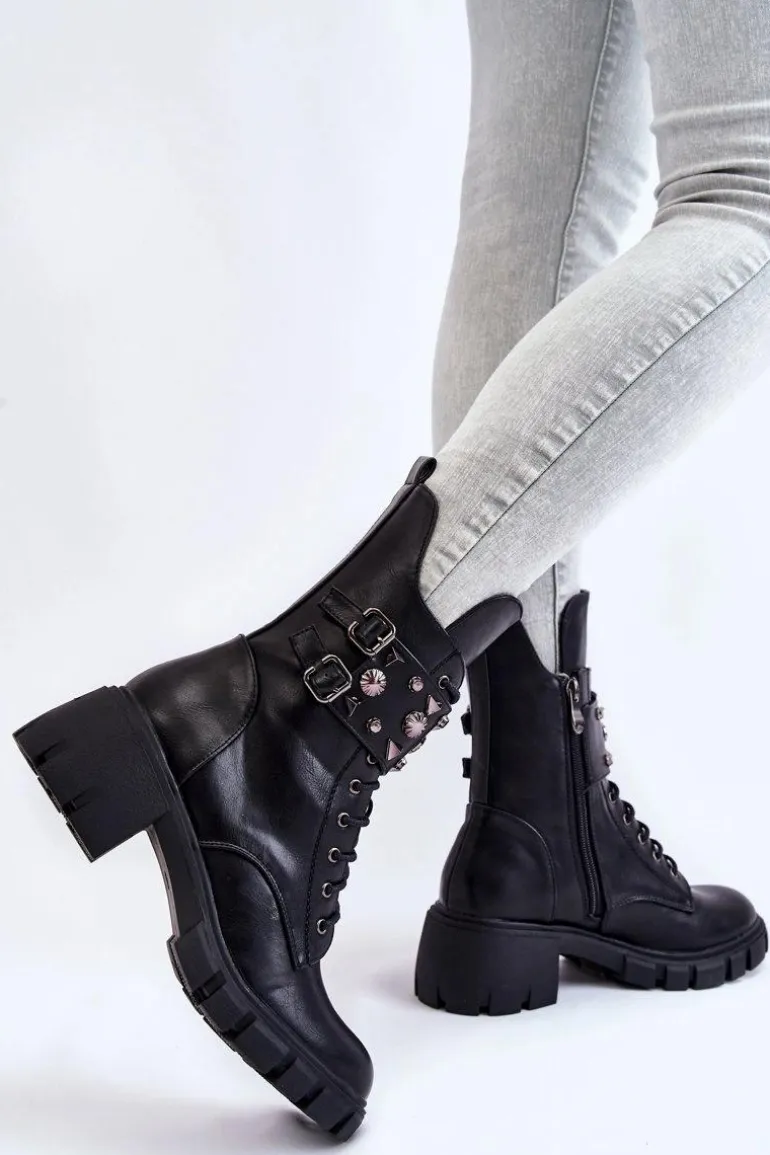 Damskie botki zostały wykonane z eko skóry. Buty zapinane na suwak oraz sznurowane. Klasyczny model został osadzony na płaskim obcasie i platformie. Botki te nie posiadają ocieplenia. Dodatkowo zostały ozdobione ćwiekami na pasku z klamrami. Zapiętek jest usztywniany. Koniecznie powinnaś je mieć w swojej szafie! Przy wyborze rozmiaru prosimy sugerować się tabelą rozmiarów.