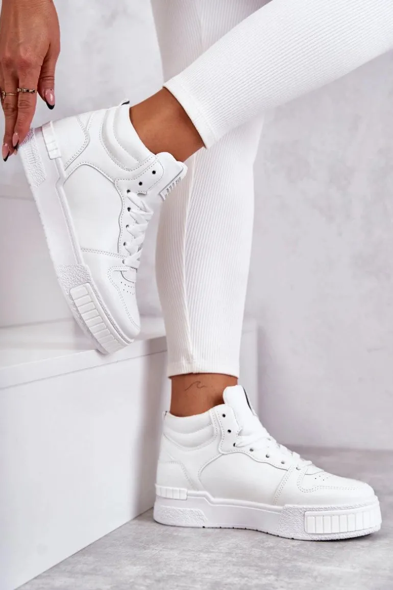Wysokie buty sportowe na platformie to totalny HIT! Świetnie sprawdzą się zarówno do spodni, jak i spódniczek czy sukienek. Wykonane z eko skóry. Wysoka cholewka i płaska podeszwa świetnie ustabilizuje stopę. Miękka wkładka została wykonana z materiału. Model wiązany na płaskie sznurowadła. Okrągły, szerszy nosek zapewni wygodę podczas użytkowania. Przy wyborze rozmiaru prosimy kierować się tabelą rozmiarów.
