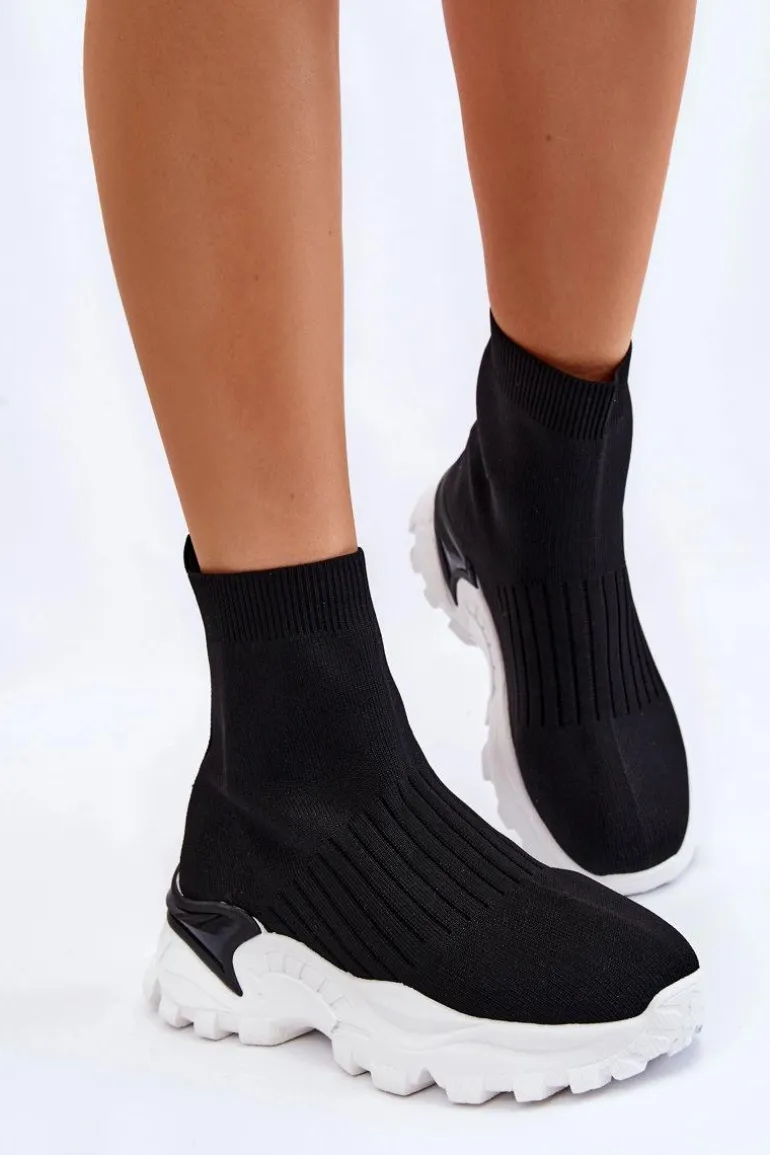 Buty sportowe zostały wykonane z materiału tekstylnego z wysoką cholewką sięgającą za kostkę. Nosek zaokrąglony. Model wsuwany ze ściągaczem u góry cholewki. Wykonane z elastycznego materiału, który dobrze dopasuje się do stopy. Wkładka z materiału jest wyciągana. Osadzone na płaskim obcasie i platformie. Przy wyborze rozmiaru prosimy kierować się tabelą rozmiarów.
