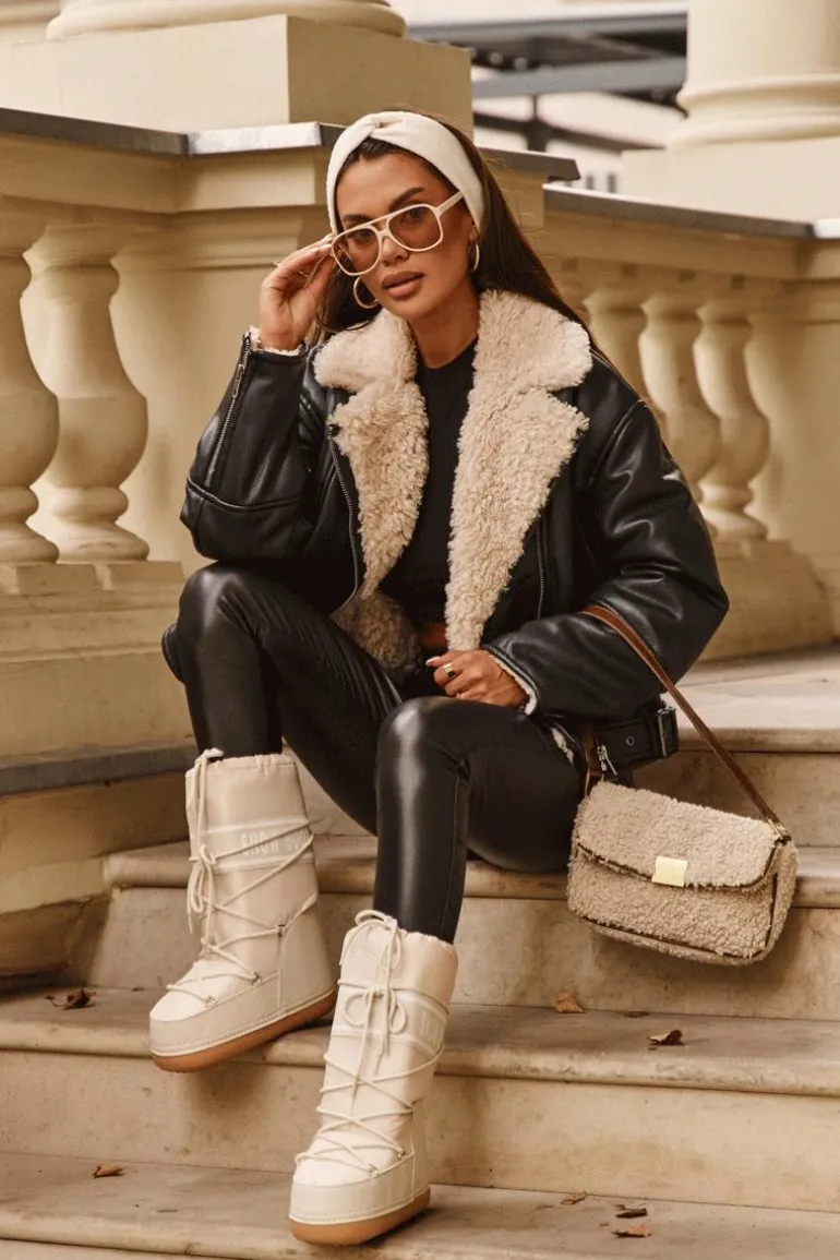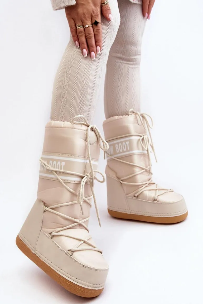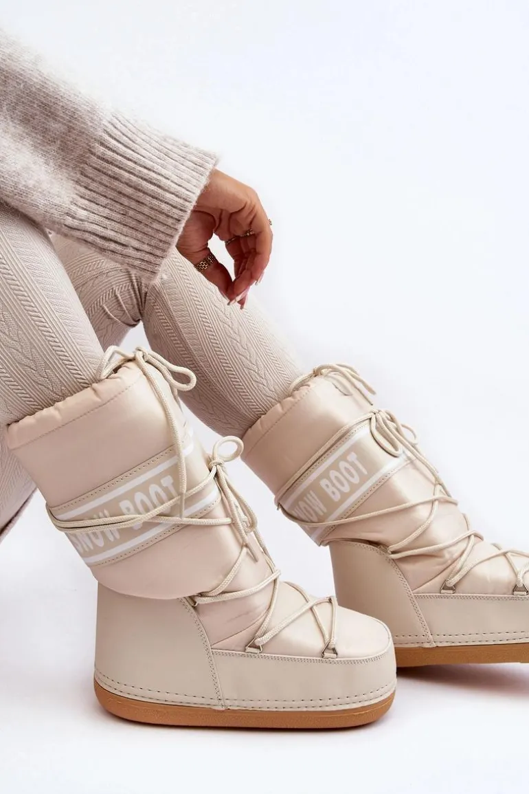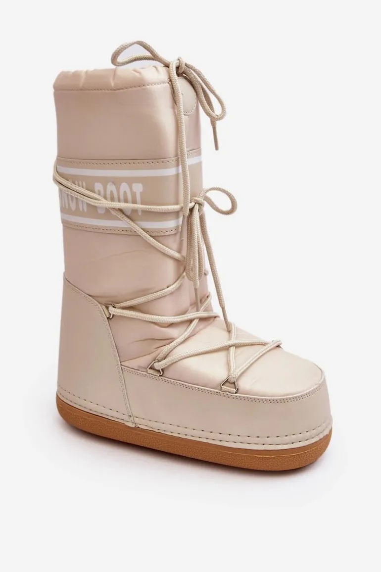 Niezwykle ciepłe i wygodne, damskie śniegowce zostały wykonane z materiałów odpornych na zimno i wiatr. Cholewka z dodatkiem eko skóry i ozdobnym napisem wzbogaci Twoją jesienno-zimową stylizację. Śniegowce są wsuwane i posiadają dodatkowe sznurowanie z przodu i u góry cholewki. Model ten został osadzony na masywnej platformie. Wewnątrz posiadają ocieplenie w postaci pianki i koca obuwniczego. Te śniegowce to idealny model na chłodniejsze dni! Przy wyborze rozmiaru prosimy sugerować się tabelą rozmiarów.