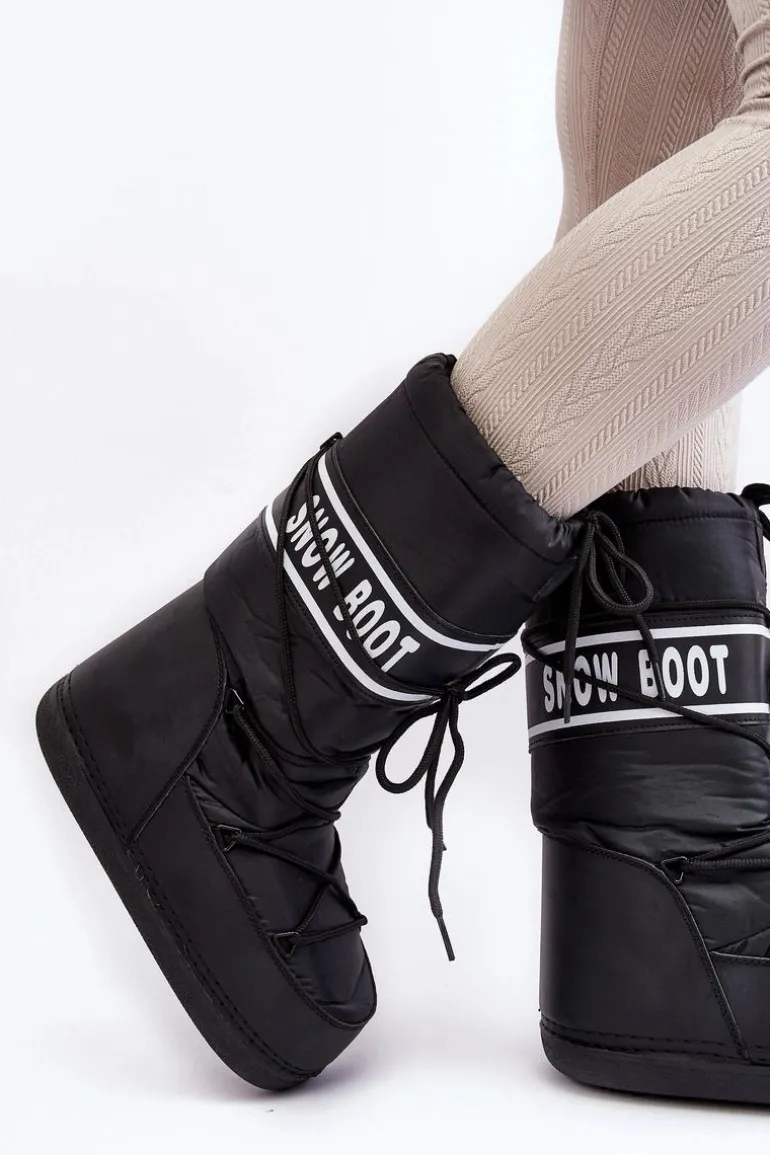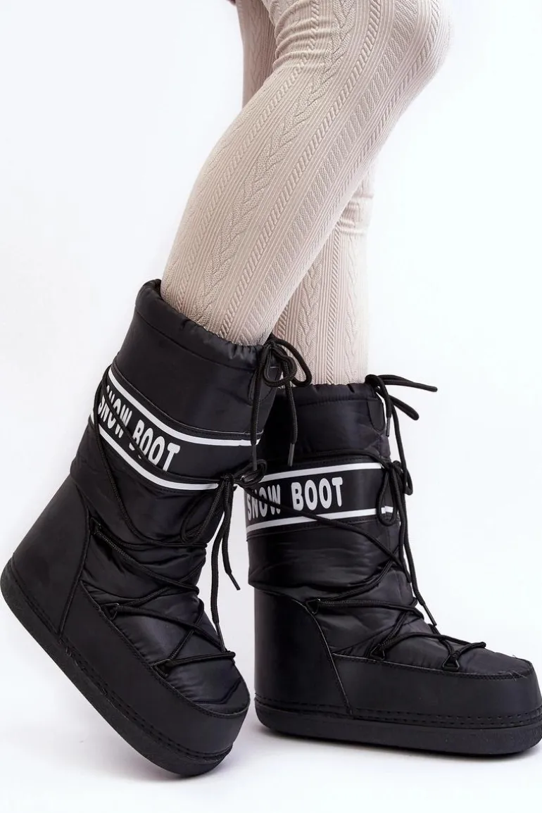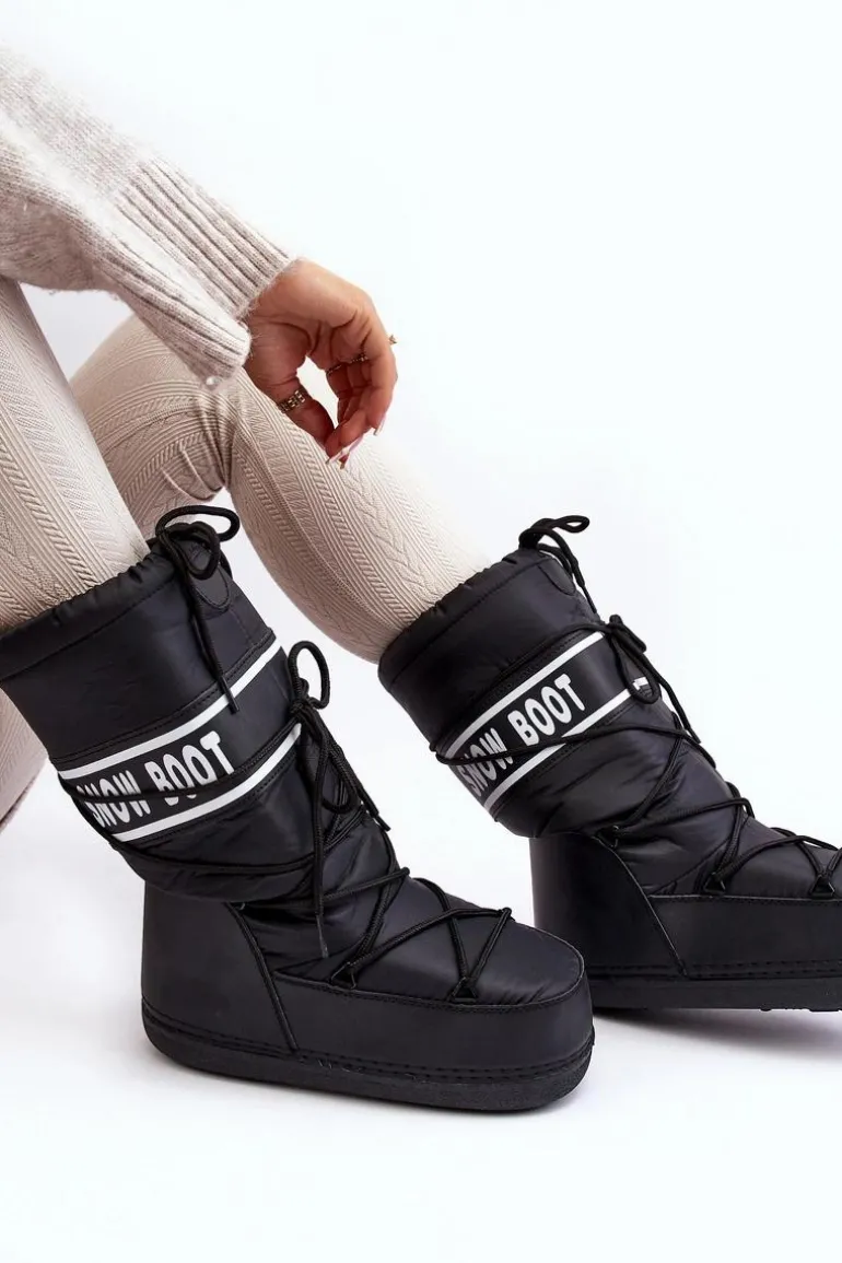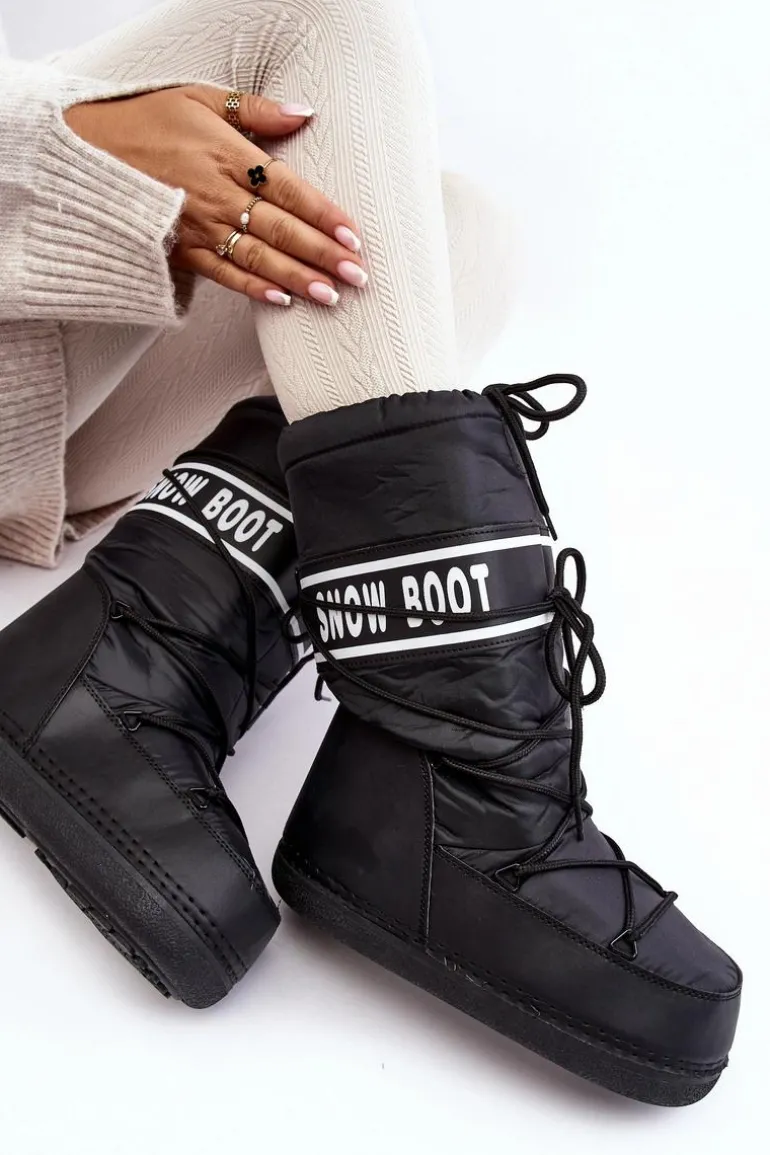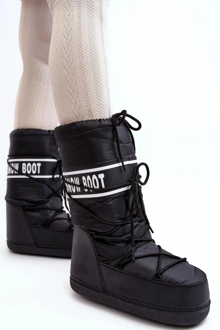 Niezwykle ciepłe i wygodne, damskie śniegowce zostały wykonane z materiałów odpornych na zimno i wiatr. Cholewka z dodatkiem eko skóry i ozdobnym napisem wzbogaci Twoją jesienno-zimową stylizację. Śniegowce są wsuwane i posiadają dodatkowe sznurowanie z przodu i u góry cholewki. Model ten został osadzony na masywnej platformie. Wewnątrz posiadają ocieplenie w postaci pianki i koca obuwniczego. Te śniegowce to idealny model na chłodniejsze dni! Przy wyborze rozmiaru prosimy sugerować się tabelą rozmiarów.