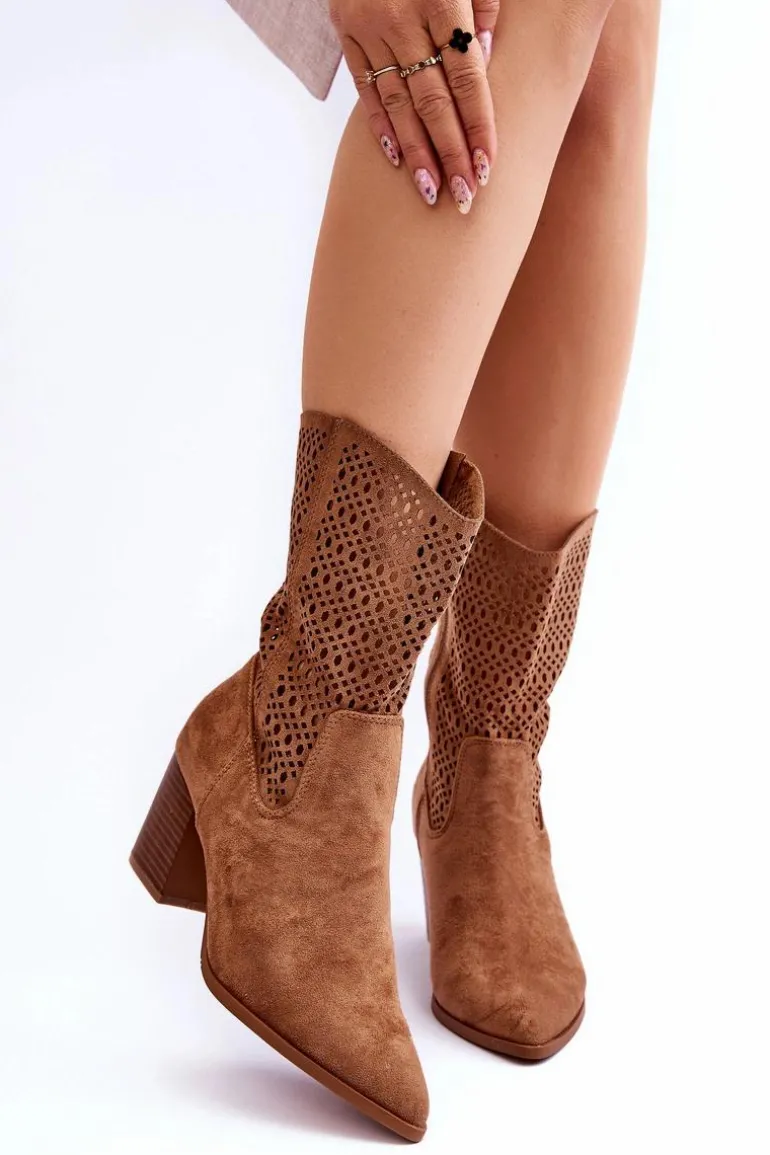Modne botki-kowbojki z wyższą cholewką. Wykonane zostały z ekologicznego zamszu z modnym, ażurowym wzorem. Materiałowa wkładka oraz usztywniany zapiętek zadbają o Twój komfort. Posiadają masywny obcas w postaci słupka. Idealnie sprawdzą się zarówno do sukienek, jak i jeansów. Przy wyborze rozmiaru prosimy sugerować się tabelą rozmiarów.