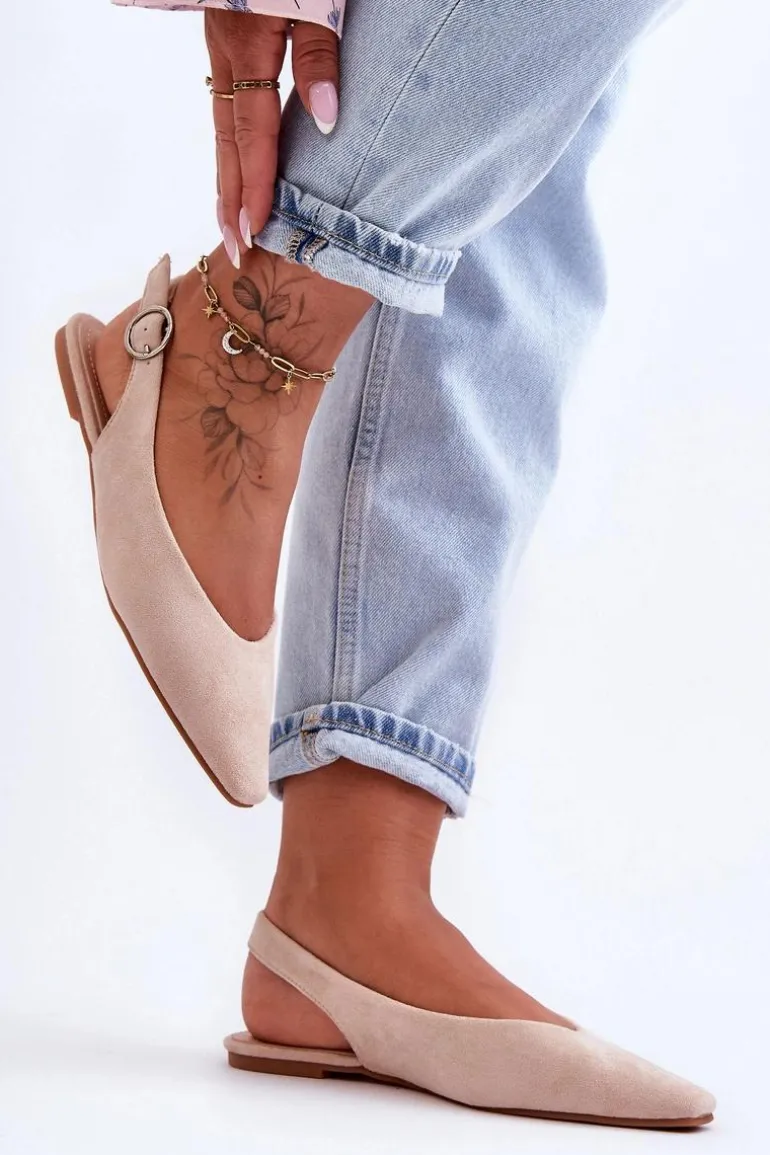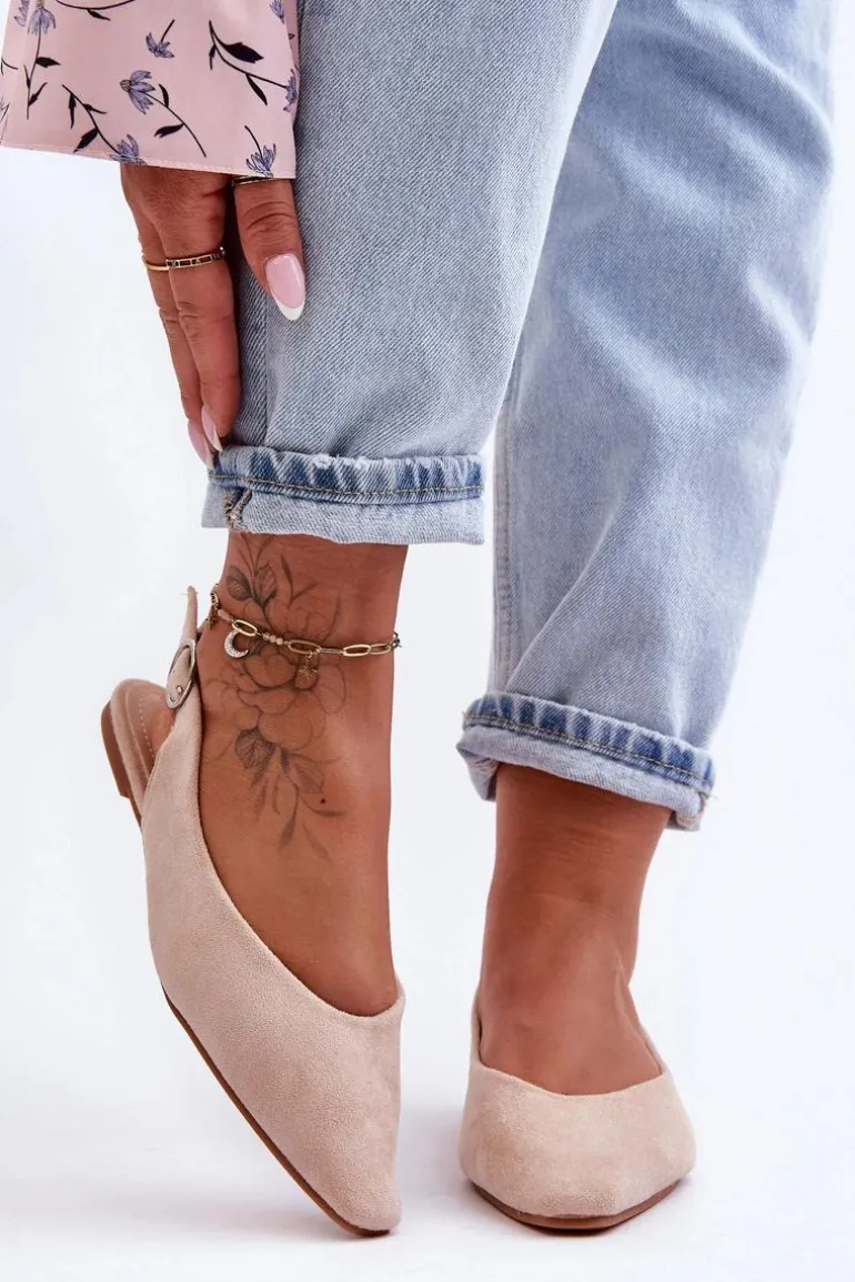 Wyjątkowe baleriny damskie posiadają odkrytą piętę i charakterystyczny, wydłużony nosek. Zostały wykonane z eko zamszu. Posiadają regulowany pasek zapinany na sprzączkę. Wkładka z eko skóry zapewni komfort podczas użytkowania. Baleriny posiadają płaski obcas oraz antypoślizgową podeszwę. Podczas wyboru rozmiaru prosimy sugerować się tabelą rozmiarów.