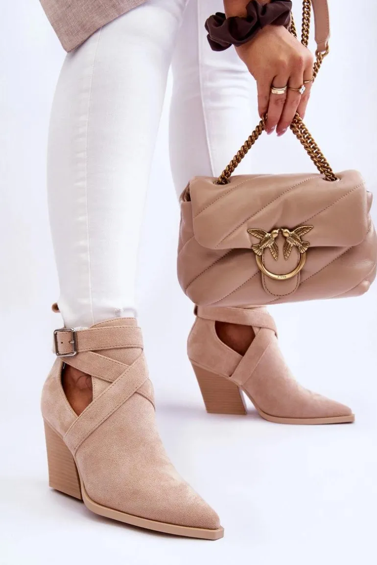 Botki o fasonie kowbojek zostały wykonane z miękkiego eko zamszu. Dodatkowo posiadają usztywniany zapiętek. Buty zostały osadzone na obcasie w postaci słupka. Cholewka z wycięciami po bokach jest charakterystyczna dla tego modelu. Te botki będą świetnym uzupełnieniem wielu stylizacji. Przy wyborze rozmiaru prosimy sugerować się tabelą rozmiarów.