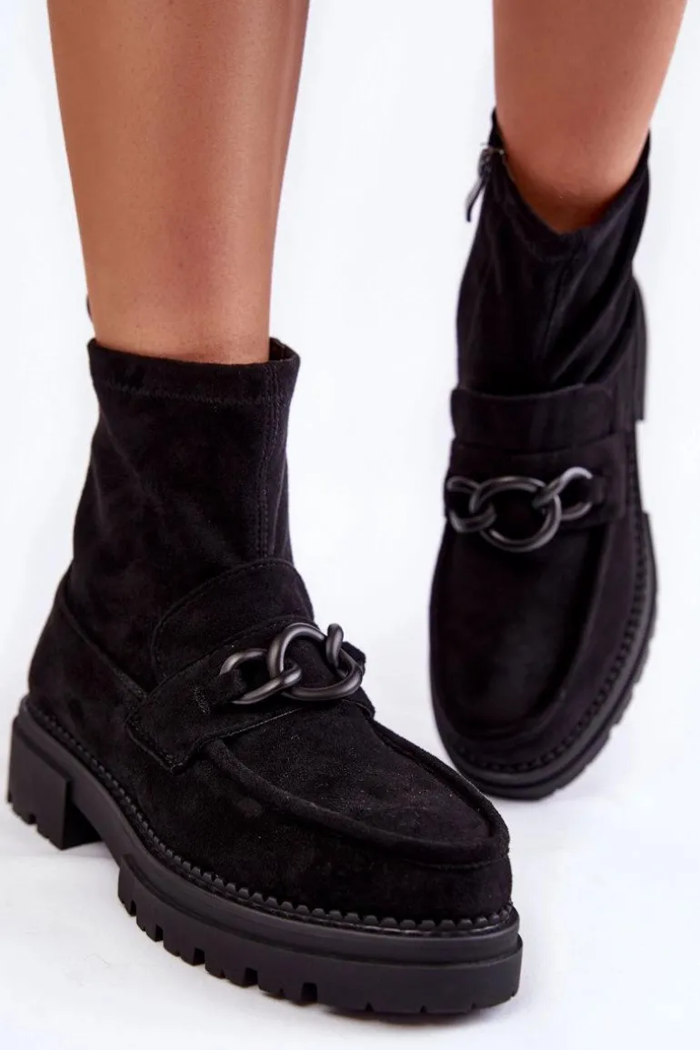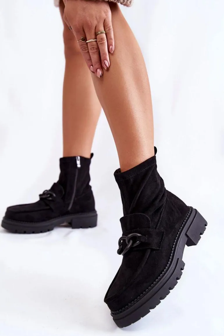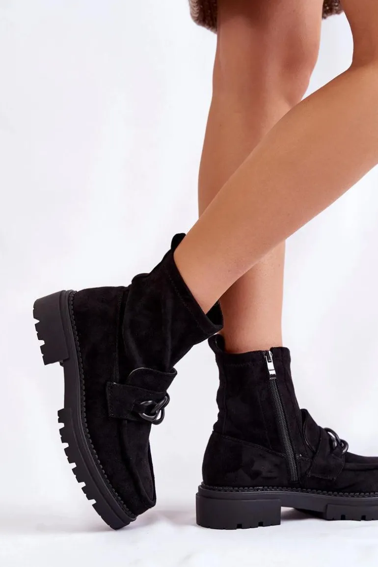 Damskie botki świetnie sprawdzą się w wielu stylizacjach! Wykonane ze skóry ekologicznej. Na boku cholewki posiadają suwak ułatwiający zakładanie obuwia. Botki osadzono na płaskim obcasie z platformą obszytą nicią. Wewnątrz, na wysokości stopy, zostały ocieplone miłym w dotyku kocem obuwniczym. Traperowa podeszwa zapewni stabilność na każdym kroku. Przy wyborze rozmiaru prosimy kierować się tabelą rozmiarów