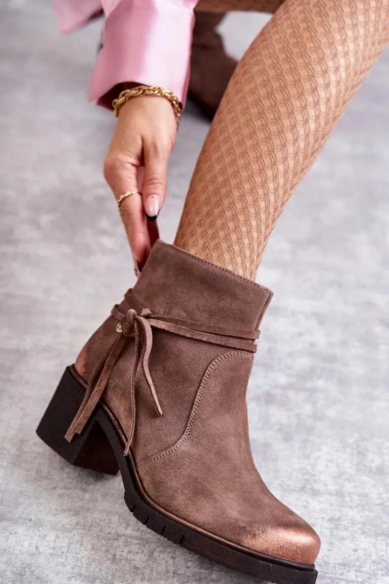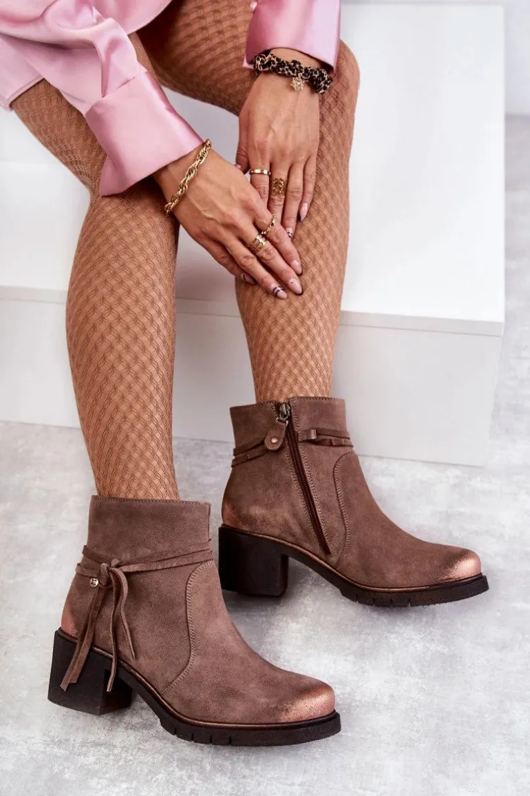 Botki damskie marki Maciejka zostały wykonane z najwyższej jakości skór. Posiadają ozdobny paseczek na boku cholewki zawiązany na supełek. Zapinane na suwak. Model z przetarciami z przodu i z tyłu. Botki osadzono na obcasie w postaci masywnego słupka. Środek został ocieplony kocem obuwniczym. Miękka wkładka zapewni komfort podczas użytkowania. Przy wyborze rozmiaru prosimy sugerować się tabelą rozmiarów.