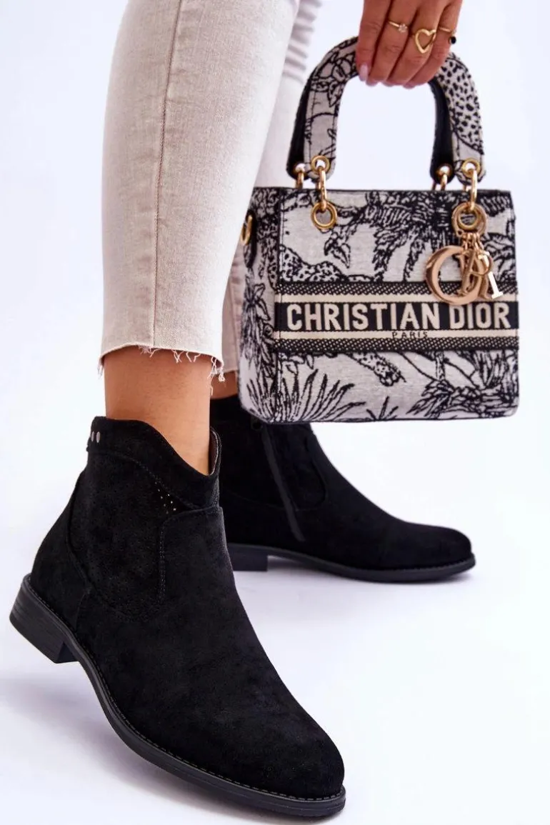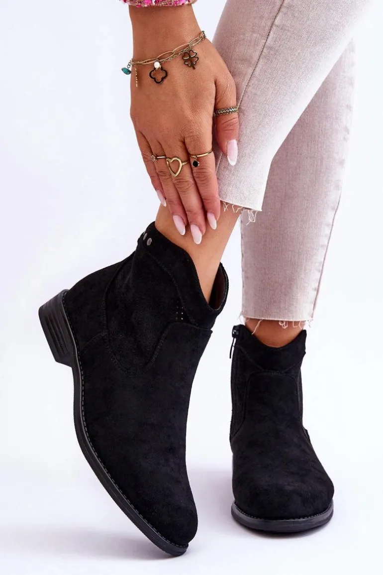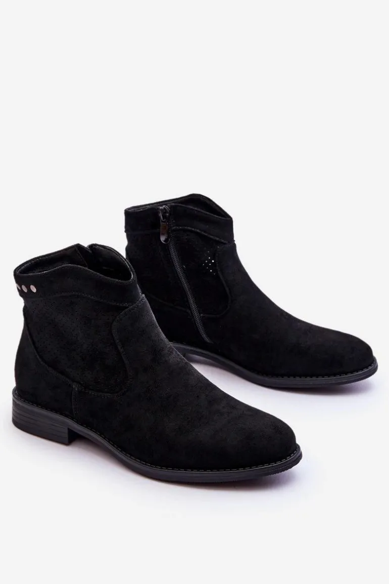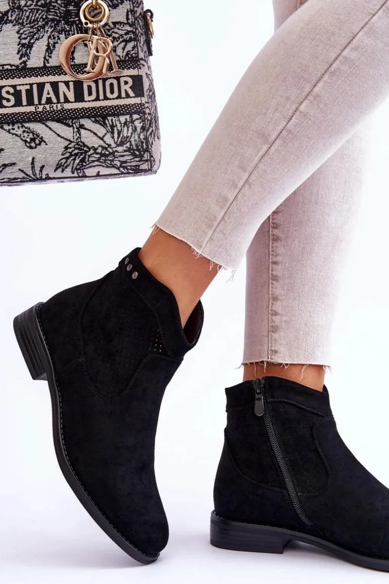 Klasyczne botki wykonane z miłego w dotyku eko zamszu z ażurową cholewką. Posiadają ozdobne elementy w postaci ćwieków. Osadzone na płaskim obcasie. Dodatkowo botki posiadają usztywniany zapiętek. Z boku cholewki znajduje się suwak ułatwiający zakładanie obuwia. Koniecznie sprawdź także pozostałe modele botków dostępnych w naszej ofercie! Przy wyborze rozmiaru prosimy sugerować się tabelą rozmiarów.