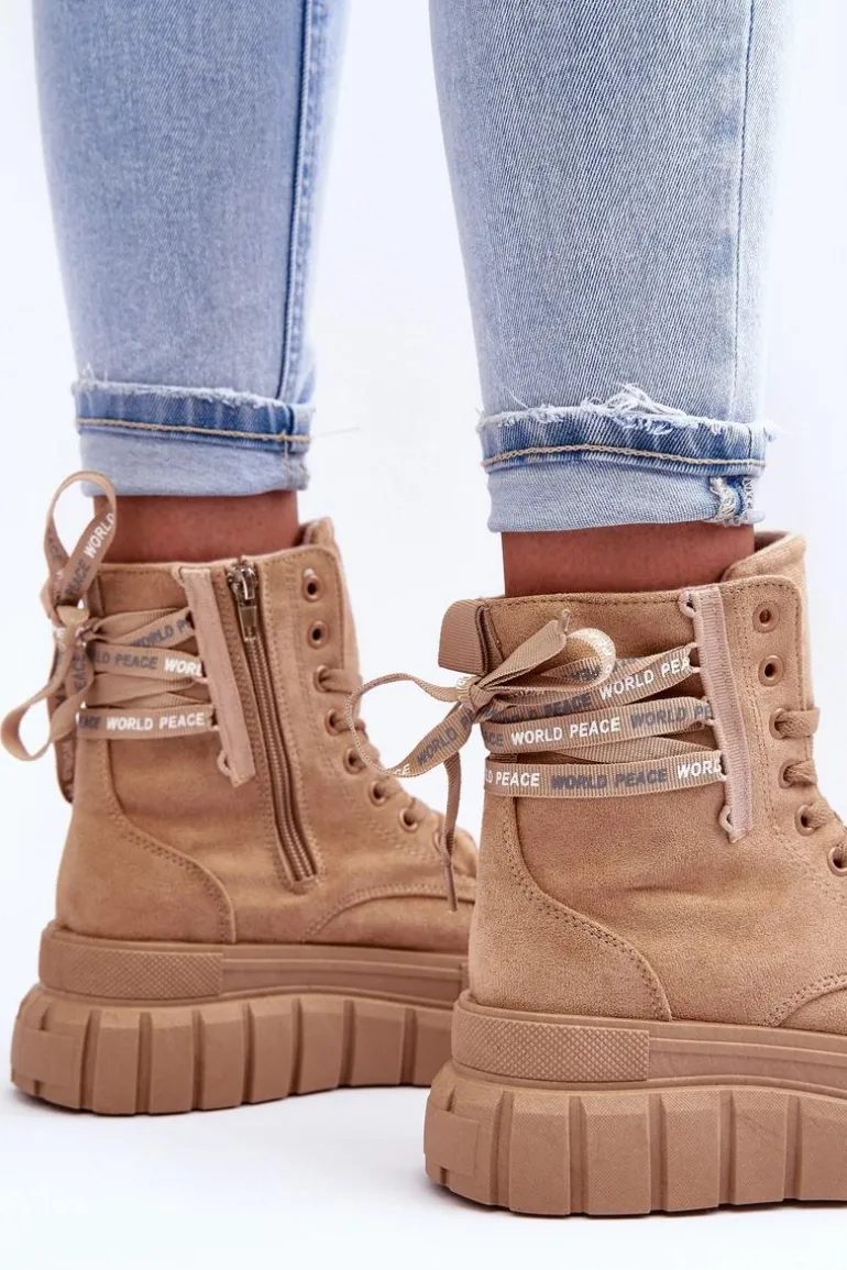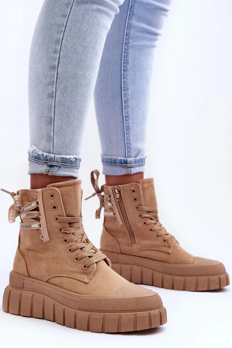 Modne botki damskie zostały osadzone na masywnej platformie z gumowego tworzywa. Wykonane z eko zamszu. Model ten zapinany jest na suwak z boku cholewki oraz dodatkowo sznurowany. Nosek jest zaokrąglony. Materiałowa wkładka zapewni komfort oraz wygodę. Koniecznie powinnaś je mieć w swojej garderobie. Przy wyborze rozmiaru prosimy sugerować się tabelą rozmiarów.