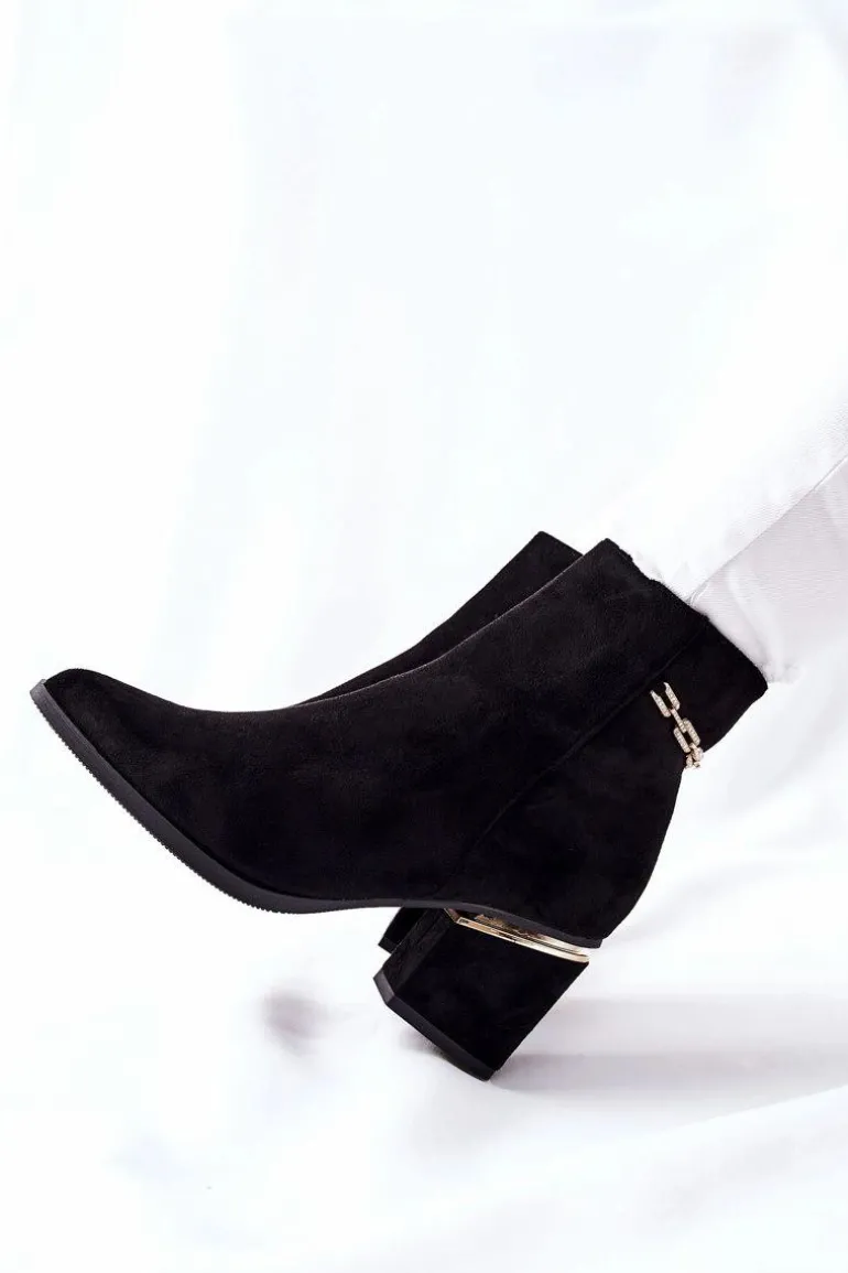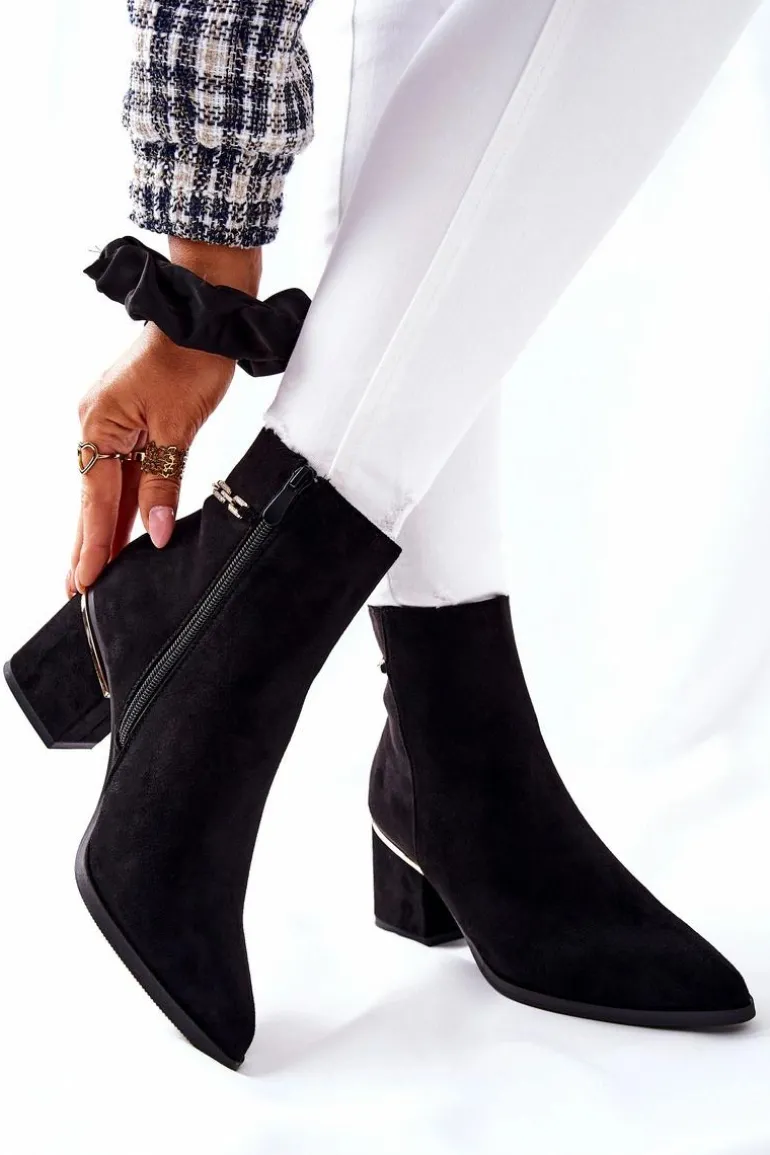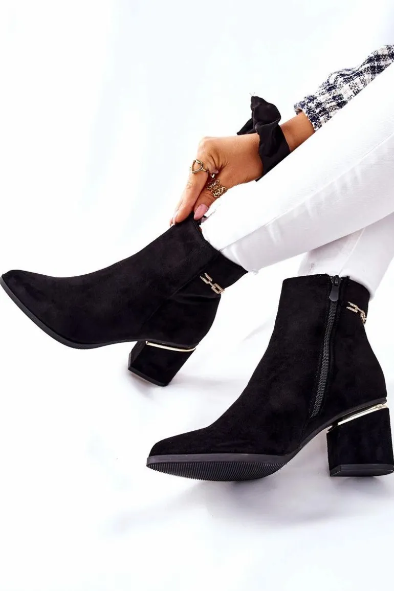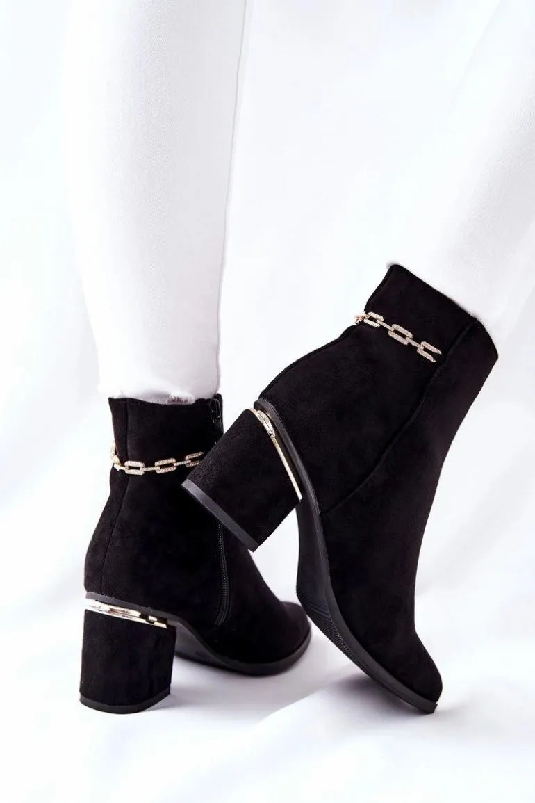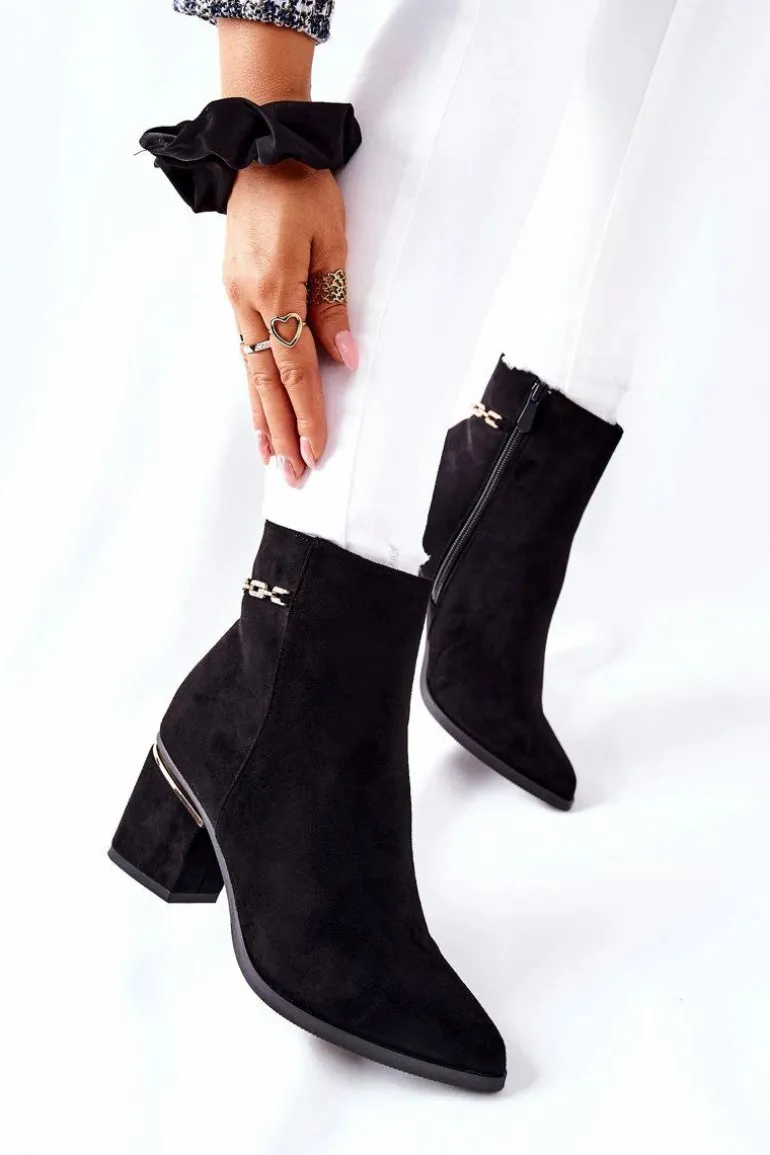 Botki wykonane z wysokiej jakości zamszowej skóry ekologicznej. Wnętrze pokryte ciepłym kocem obuwniczym. Fason o migdałowym nosku, połączony ze złotym zdobieniem na słupku oraz pięknym łańcuszkiem na cholewce – są po prostu cudowne! Zakładanie ułatwi wszyty na boku suwak. Przy wyborze rozmiaru prosimy sugerować się tabelą rozmiarów.
