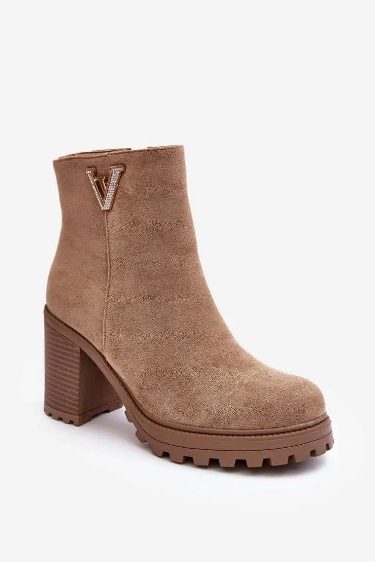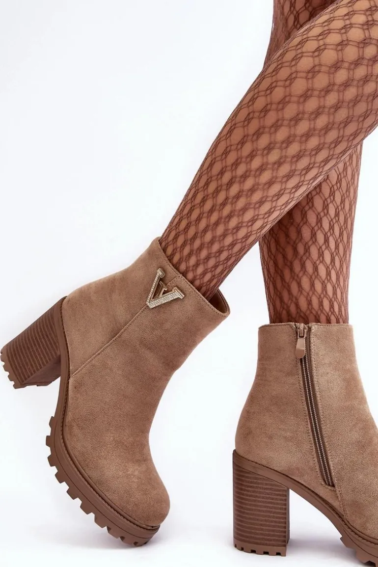 Botki damskie osadzone na obcasie w postaci słupka oraz platformie. Zostały wykonane z eko zamszu. Na cholewce z boku umieszczono ozdobę w postaci litery z dżetami. Środek nie jest ocieplony. Usztywniony zapiętek zapewni stabilizację. Model ten będzie idealnym uzupełnieniem jesienno-zimowych stylizacji! Przy wyborze rozmiaru prosimy sugerować się tabelą rozmiarów.