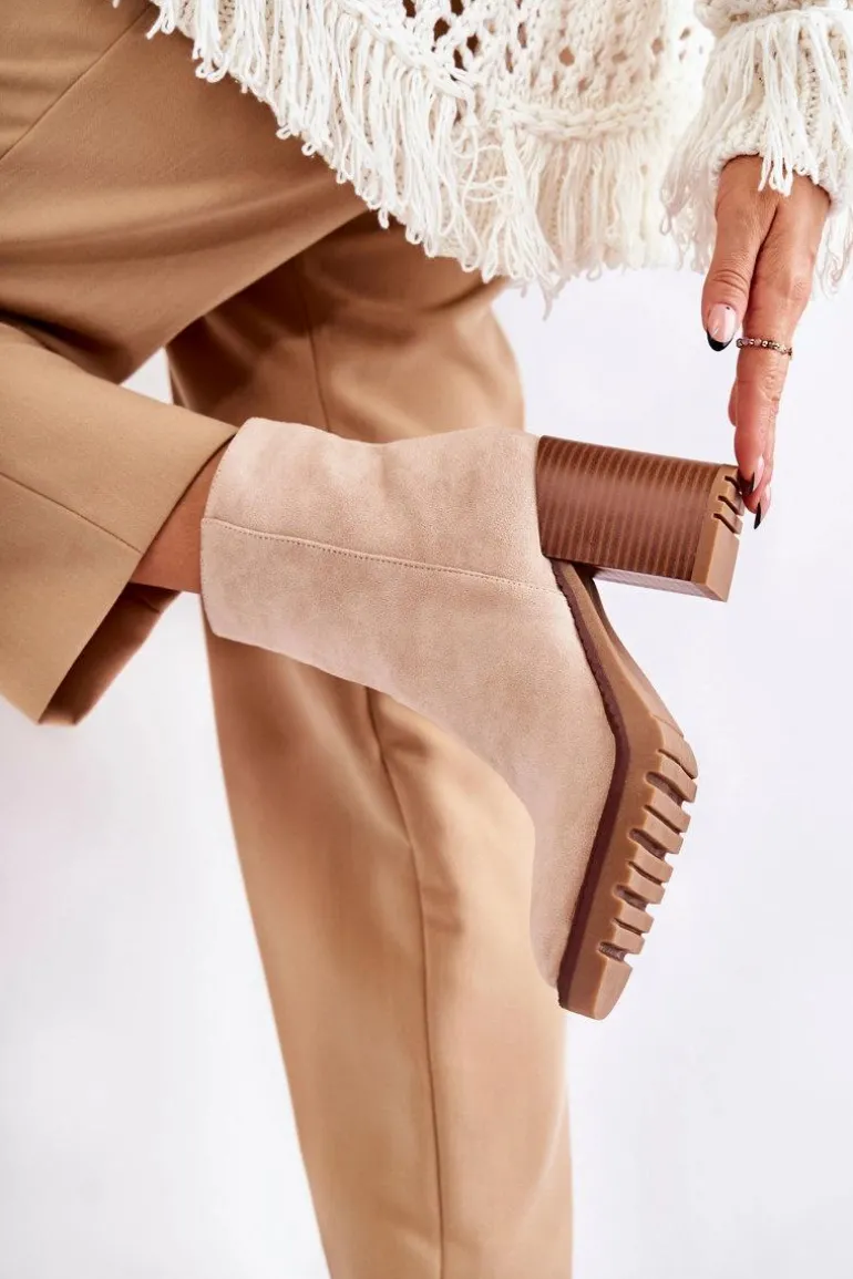 Świetne botki wykonane z miłego w dotyku eko zamszu. Model osadzony na delikatnej platformie i obcasie w postaci słupka. Buty te posiadają lekko kwadratowy nosek oraz usztywniany zapiętek. Cholewka za kostkę posiada suwak ułatwiający zakładanie obuwia. Model wygodny i stabilny. Świetnie będą komponować się plisowanymi spódnicami. Przy wyborze rozmiaru prosimy sugerować się tabelą rozmiarów.