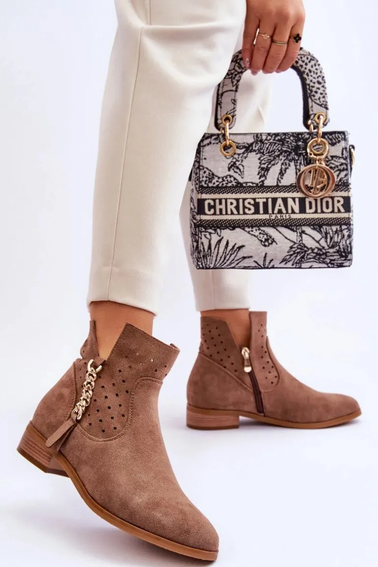 Botki zostały wykonane z eko zamszu. Posiadają ażurowe zdobienie na cholewce oraz ozdobny łańcuszek. Wewnątrz obuwia wkładka została wykonana z eko skóry. Zakładanie ułatwi wszyty z boku suwak. Płaski obcas zapewni stabilność na każdym kroku. Model ten dodatkowo posiada usztywniany zapiętek. Nosek w kształcie delikatnego migdała optycznie wysmukli stopę. Przy wyborze rozmiaru prosimy sugerować się tabelą rozmiarów.