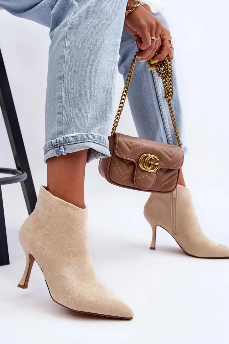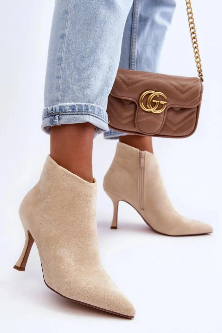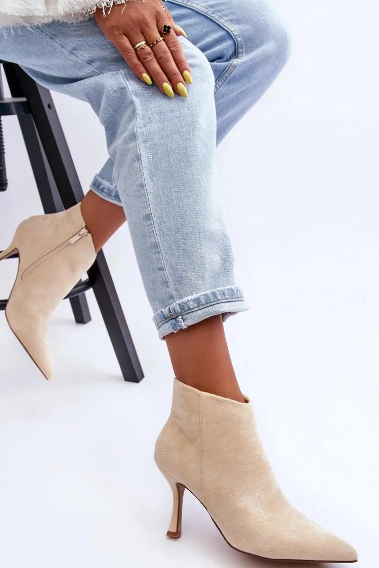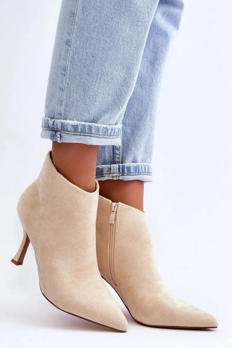 Eleganckie botki damskie zostały wykonane z eko zamszu. Model osadzony na obcasie w postaci szpilki, z noskiem w szpic świetnie wysmukli nogi. Botki są zapinane z boku na suwak. Zapiętek w tych botkach jest usztywniany. Model ten świetnie sprawdzi się w wielu stylizacjach np.: do sukienek, spódnic czy spodni. Te botki koniecznie powinny znaleźć się w Twojej szafie! Przy wyborze rozmiaru prosimy sugerować się tabelą rozmiarów.