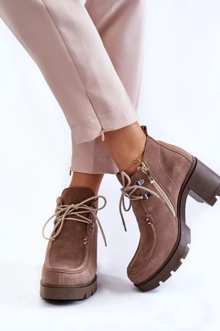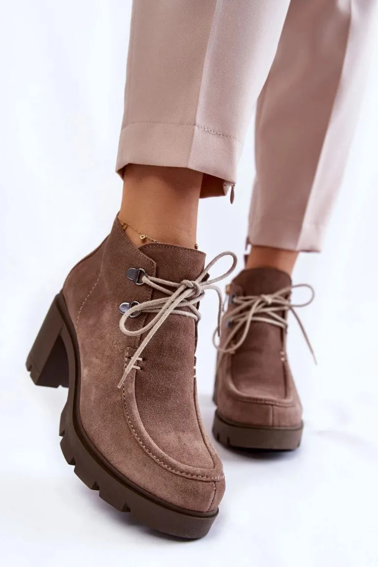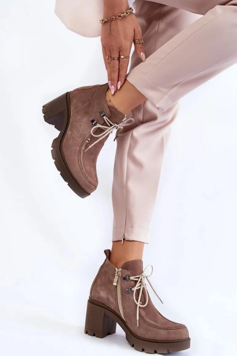 Botki o fasonie trzewików posiadające cholewkę sięgającą powyżej kostki. Gruby, stabilny obcas oraz okrągły nosek. Wiązane na cienkie, okrągłe sznurówki w dopasowanym do obuwia kolorze. Wykonane ze skóry naturalnej. Całość tworzy niebanalny charakter. Botki są ocieplane kocem obuwniczym, z usztywnianym zapiętkiem. Posiadają suwak z boku cholewki ułatwiający zakładanie obuwia. Idealne do wielu stylizacji! Przy wyborze rozmiaru prosimy sugerować się tabelą rozmiarów.