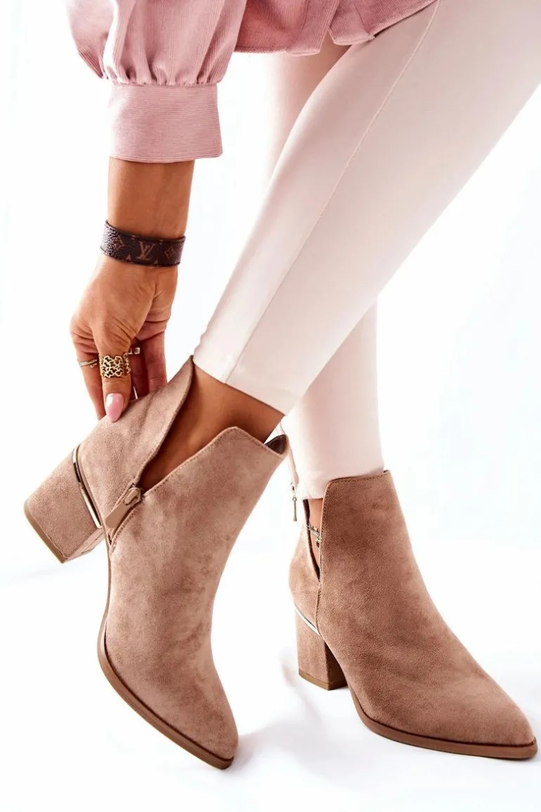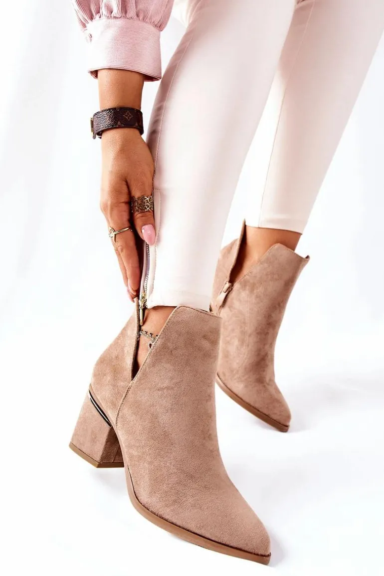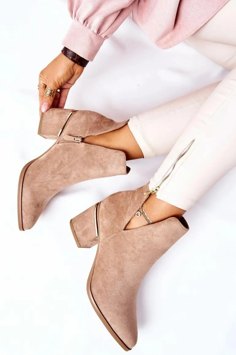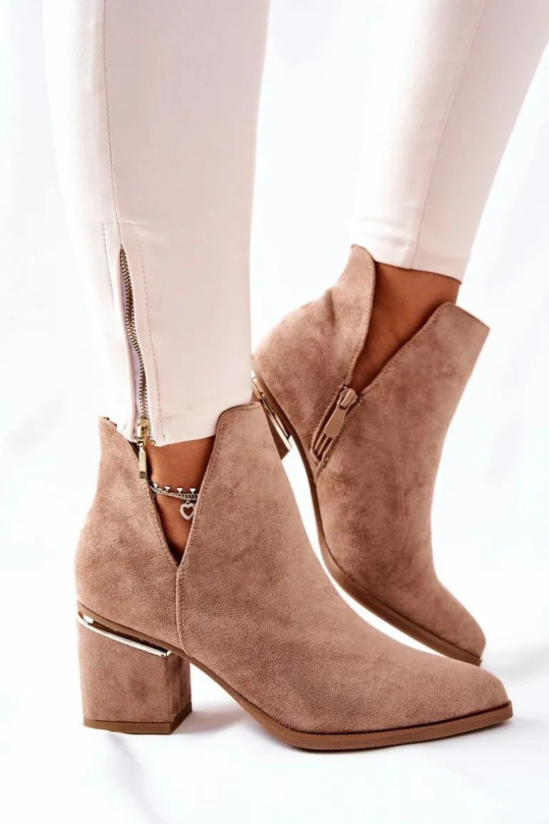 Klasyczne botki, dostępne w kilku kolorach. Cholewka z wycięciami na boku, wykonana z ekologicznego zamszu. Dzięki złotemu zdobieniu na słupku świetnie się prezentują w każdej stylizacji. Na boku znajduje się delikatny suwak, ułatwiający zakładanie. Przy wyborze rozmiaru prosimy sugerować się tabelą rozmiarów.