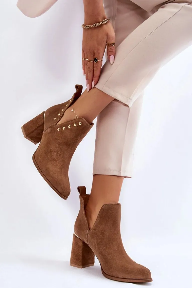 Botki to nieodłączny element jesienno-zimowych stylizacji. Firma Lewski ma propozycje na każdy sezon. Prezentowany model dzięki delikatnym wycięciom, idealnie sprawdzi się podczas jesiennych stylizacji. Zdobienia na cholewce w postaci złotych dżetów oraz złotej wstawki na obcasie, podkreśla ich elegancki styl. Botki w całości zostały wykonane z naturalnego zamszu. Przy wyborze rozmiaru prosimy sugerować się tabelą rozmiarów.