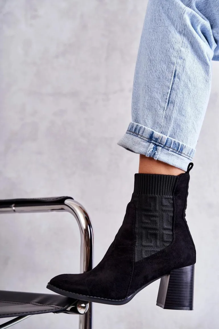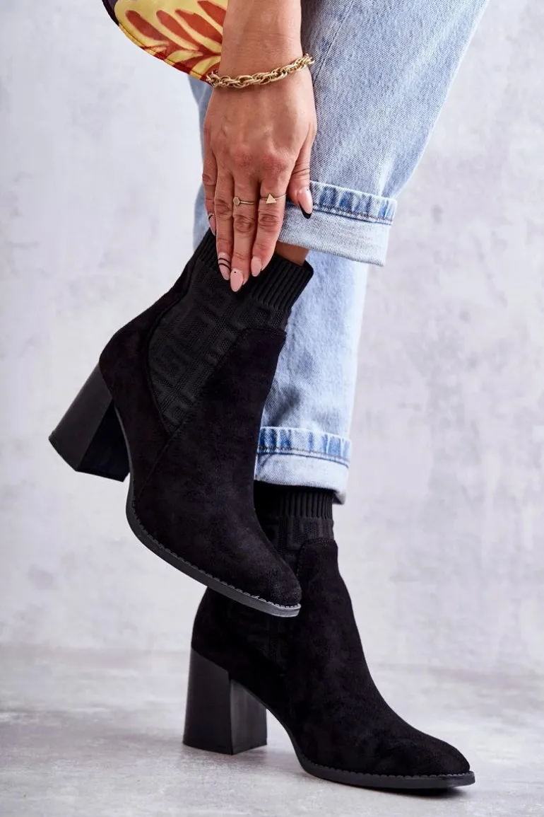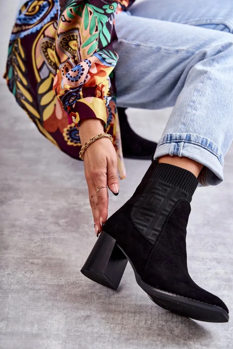 Świetne botki damskie o modnym fasonie. Wykonane z połączenia eko zamszu oraz elastycznej tkaniny. Model ten osadzono na obcasie w postaci masywnego słupka. Nosek jest kwadratowy. Botki posiadają usztywniany zapiętek. W środku są częściowo ocieplone kocem obuwniczym. Wykorzystasz je w wielu sytuacjach: do pracy, na spotkanie ze znajomymi czy na randkę. Przy wyborze rozmiaru prosimy sugerować się tabelą rozmiarów.