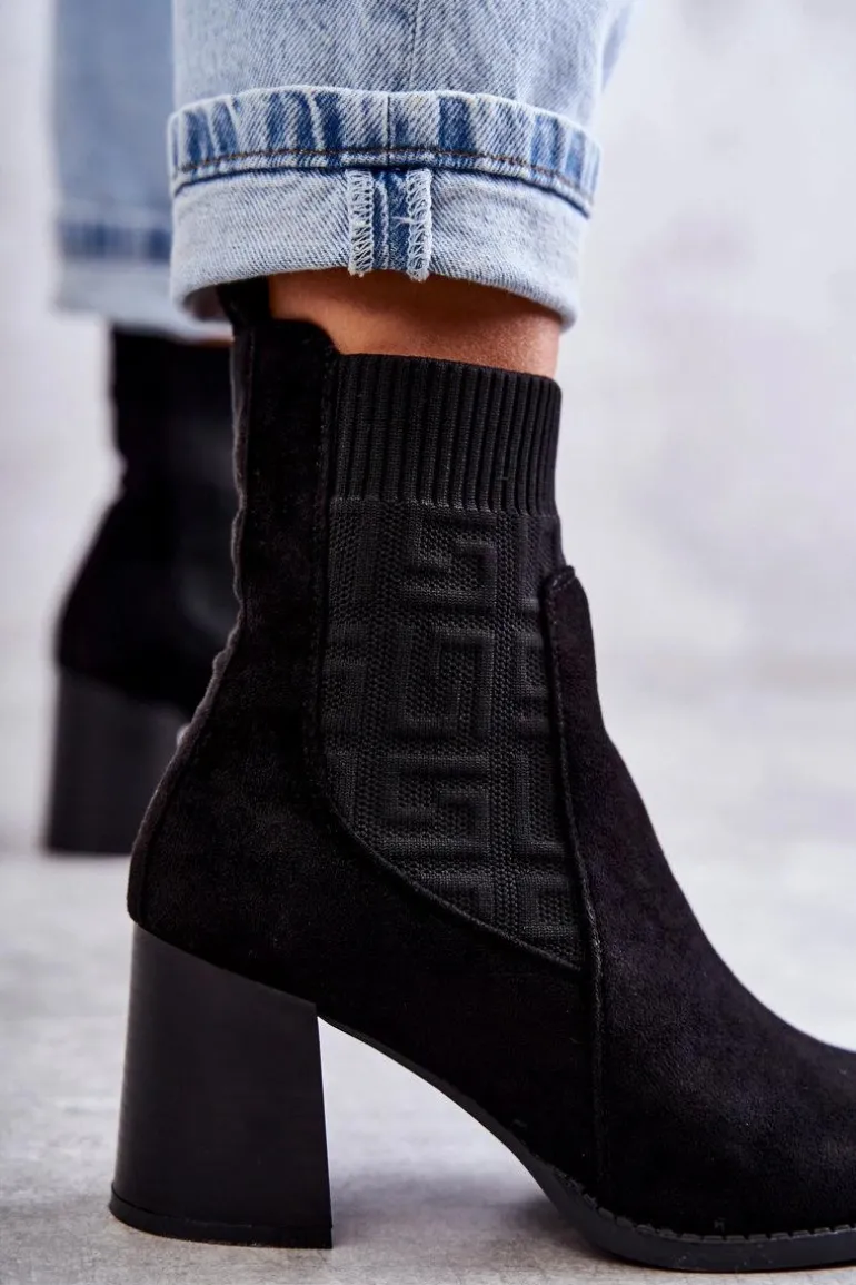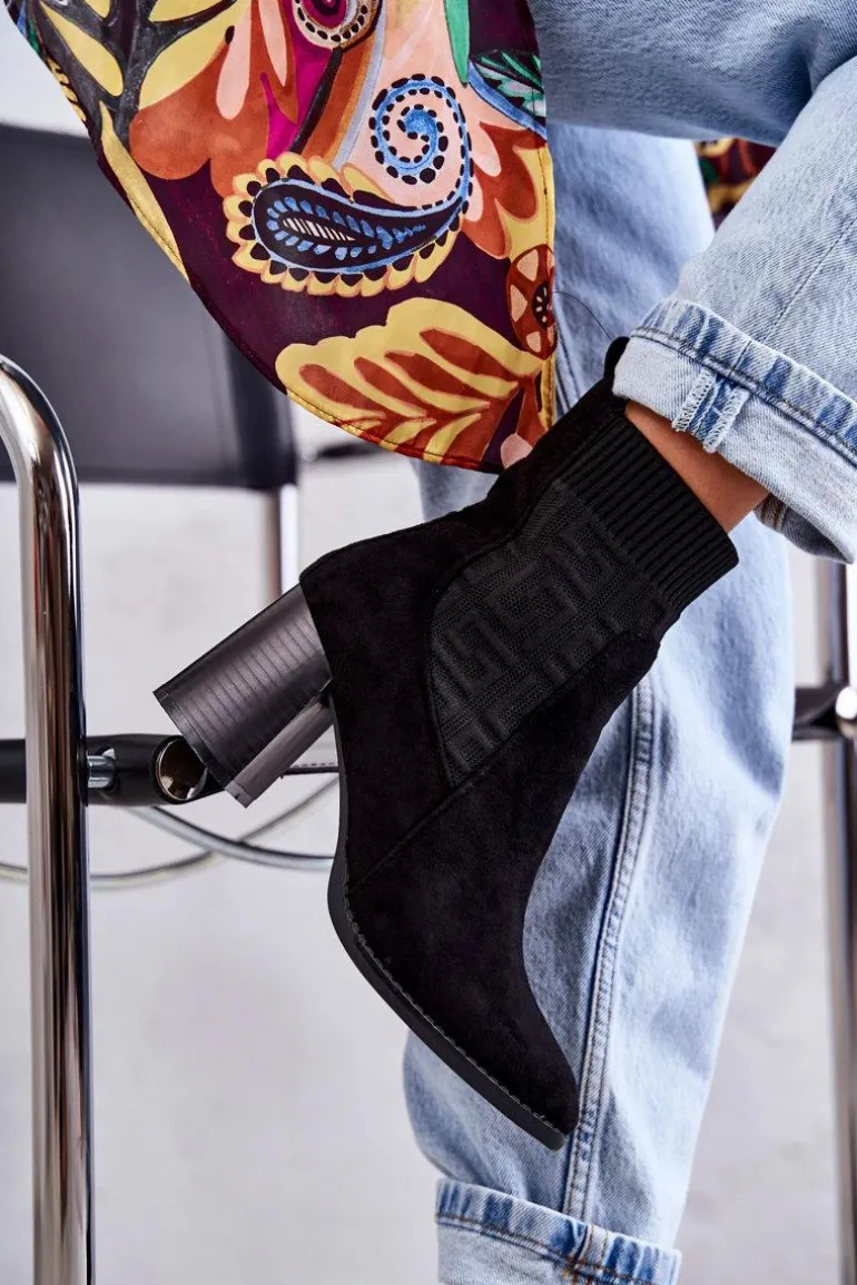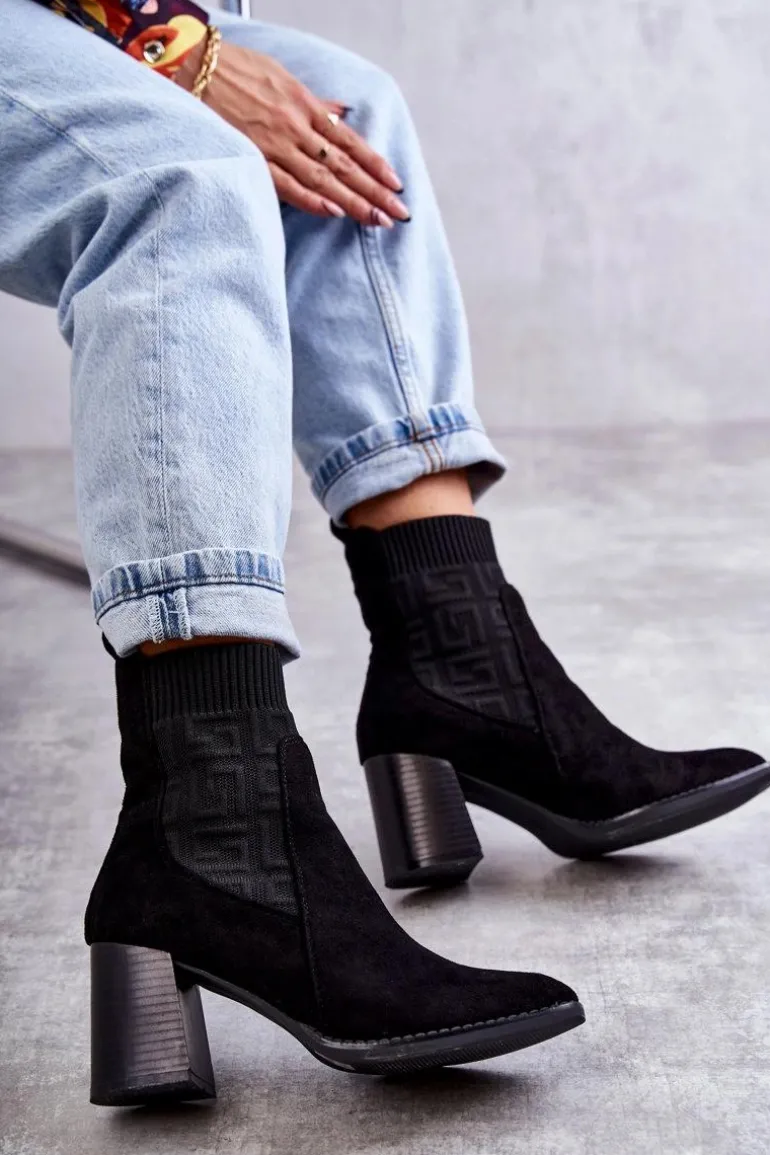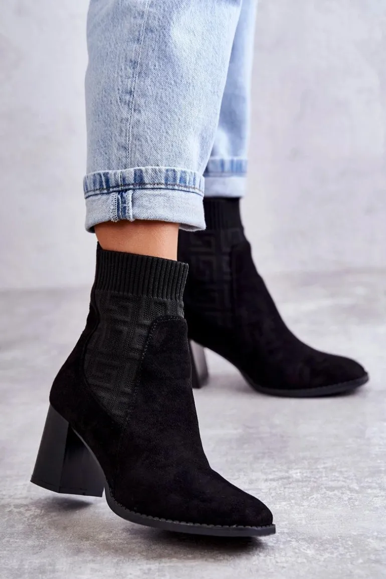 Świetne botki damskie o modnym fasonie. Wykonane z połączenia eko zamszu oraz elastycznej tkaniny. Model ten osadzono na obcasie w postaci masywnego słupka. Nosek jest kwadratowy. Botki posiadają usztywniany zapiętek. W środku są częściowo ocieplone kocem obuwniczym. Wykorzystasz je w wielu sytuacjach: do pracy, na spotkanie ze znajomymi czy na randkę. Przy wyborze rozmiaru prosimy sugerować się tabelą rozmiarów.