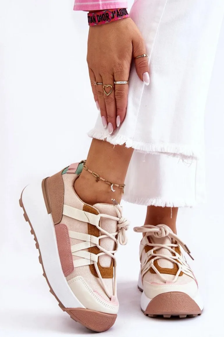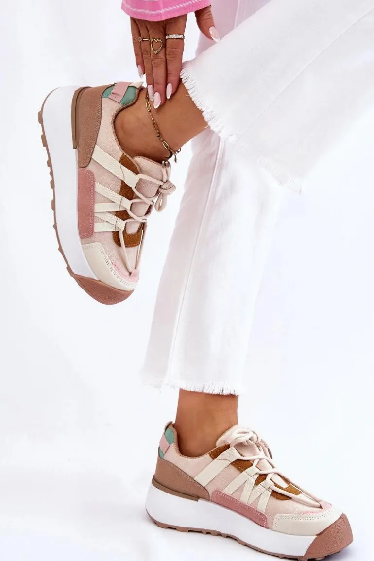Damskie buty sportowe wykonane z eko zamszu. Zostały osadzone na masywnej platformie, która delikatnie uniesie Twoją sylwetkę. Model ten posiada klasyczne sznurowanie, które pozwoli na odpowiednie dopasowanie obuwia do tęgości nogi. Dodatkowo zapiętek jest usztywniany, a wkładka w tych butach jest wymienna. Przy wyborze rozmiaru prosimy kierować się tabelą rozmiarów.