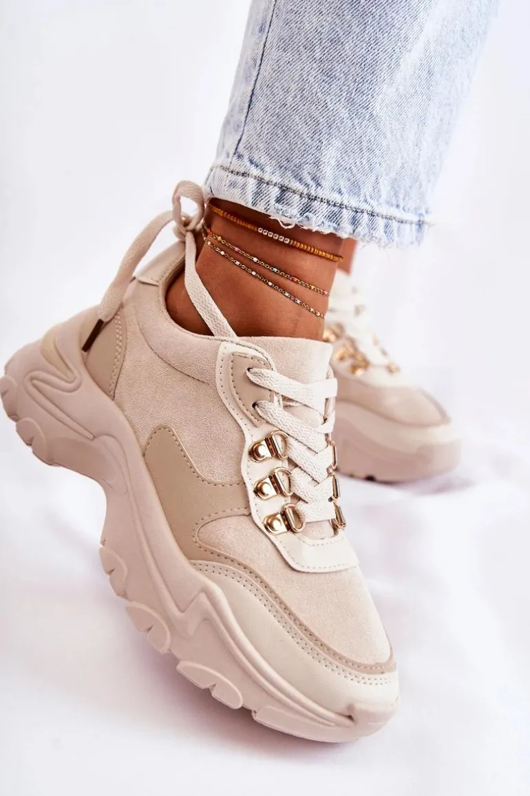 Modne sportowe buty damskie zostały wykonane z przyjemnego w dotyku eko zamszu oraz eko skóry. Cholewka do kostki. Model z wiązaniem, które pozwoli na odpowiednie dopasowanie obuwia do tęgości nogi. Buty osadzone na masywnym, płaskim obcasie oraz platformie. Sneakersy są wygodne w użytkowaniu, dzięki materiałowej wkładce, która jest dodatkowo wyciągana. Model z zaokrąglonym noskiem. Przy wyborze rozmiaru prosimy kierować się tabelą rozmiarów.