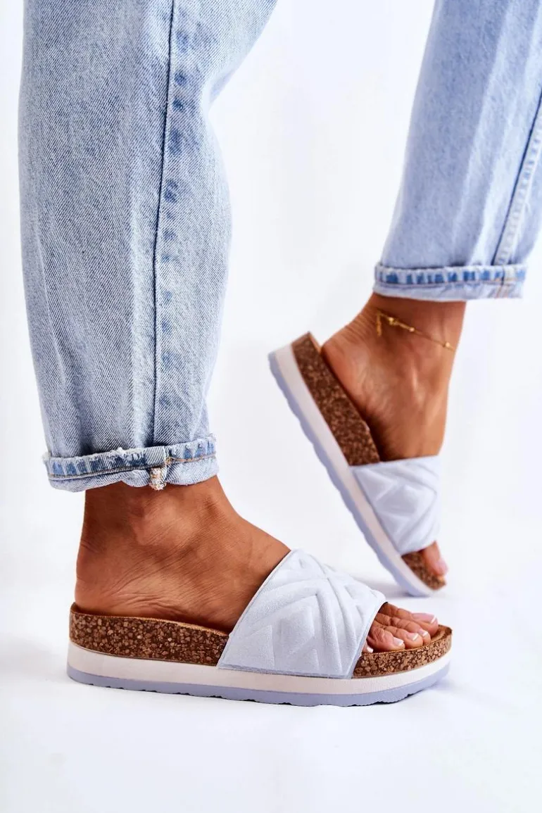 Modne klapki damskie wykonane z miłego w dotyku eko zamszu. Model osadzone na masywnej korkowej platformie z podeszwą z tworzywa sztucznego. Wkładka jest profilowana i także wykonana z eko zamszu, która zapewni komfort podczas użytkowania. Model z odkrytym noskiem. Świetny fason na upalne dni, który powinnaś mieć w swojej szafie! Przy wyborze rozmiaru prosimy sugerować się tabelą rozmiarów.