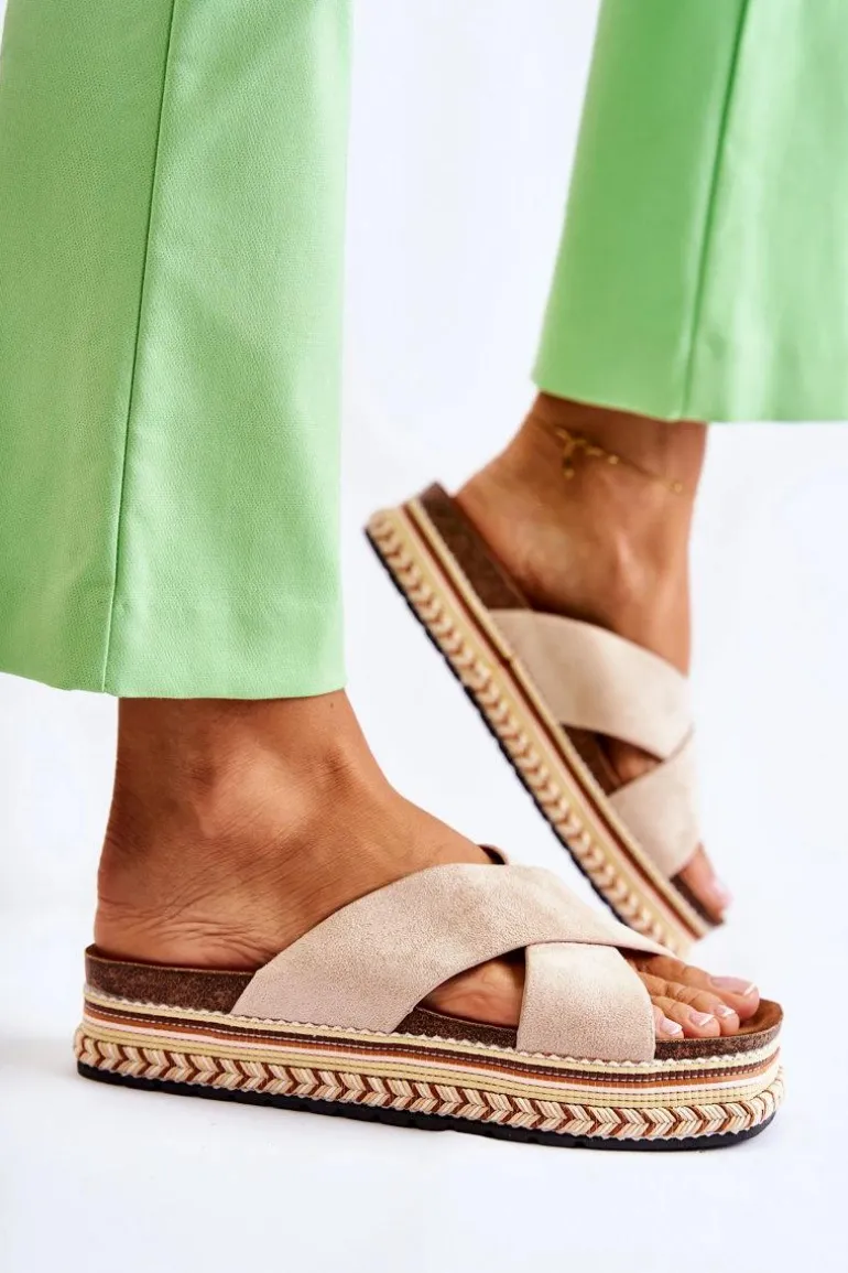Klasyczne klapki damskie zostały wykonane z eko zamszu. Paski klapek krzyżują się na przodzie. Wkładka jest wykonana z eko skóry. Klapki osadzone na platformie ozdobionej warkoczem i elementami z tworzywa sztucznego. Model z odkrytym, kwadratowym noskiem. Profilowana wkładka zapewni wygodę podczas użytkowania. Koniecznie sprawdź pozostałe modele damskich klapek! Przy wyborze rozmiaru prosimy sugerować się tabelą rozmiarów.