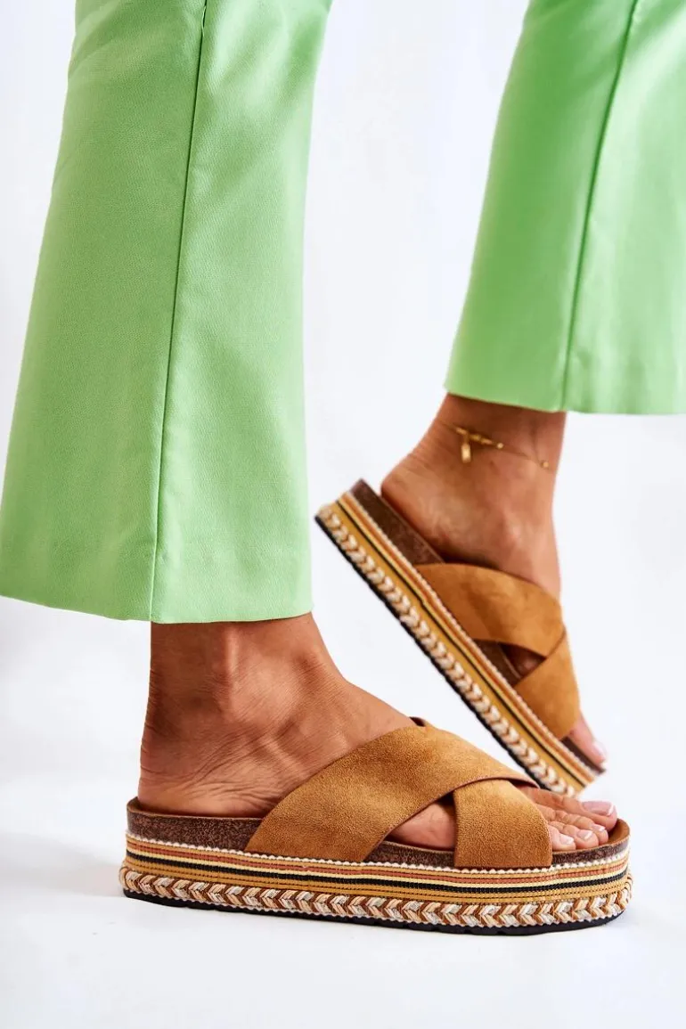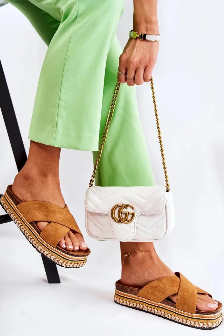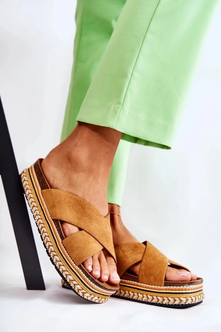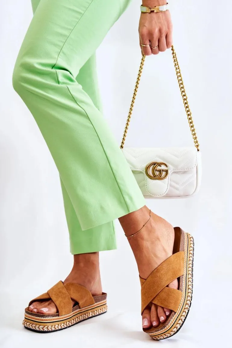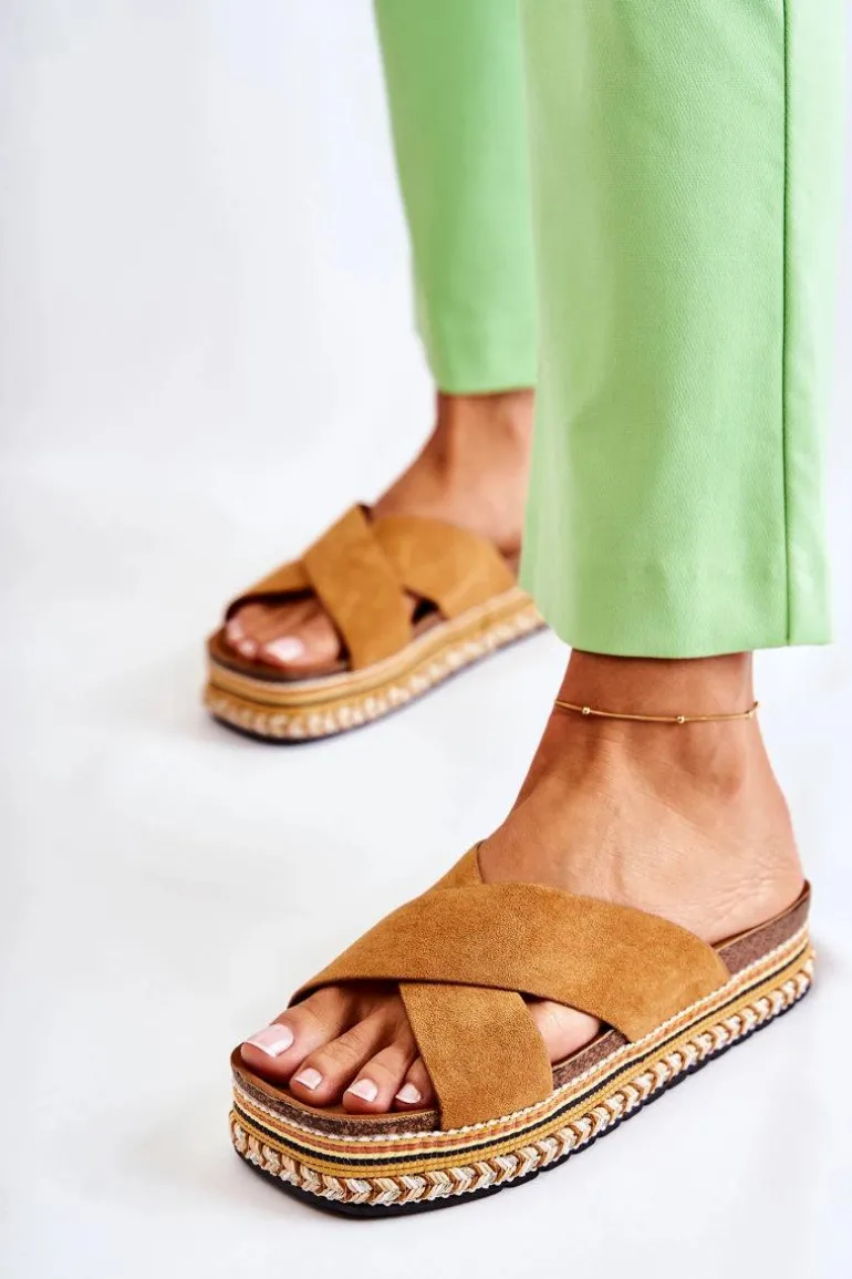 Klasyczne klapki damskie zostały wykonane z eko zamszu. Paski klapek krzyżują się na przodzie. Wkładka jest wykonana z eko skóry. Klapki osadzone na platformie ozdobionej warkoczem i elementami z tworzywa sztucznego. Model z odkrytym, kwadratowym noskiem. Profilowana wkładka zapewni wygodę podczas użytkowania. Koniecznie sprawdź pozostałe modele damskich klapek! Przy wyborze rozmiaru prosimy sugerować się tabelą rozmiarów.