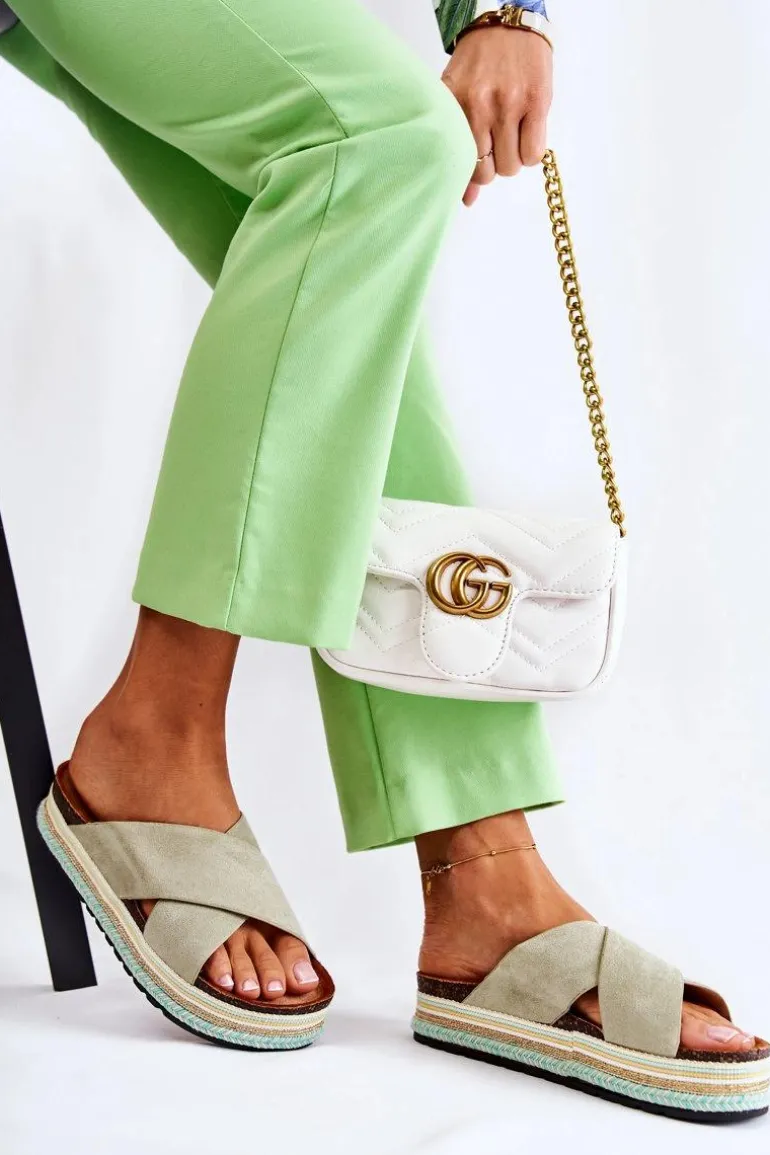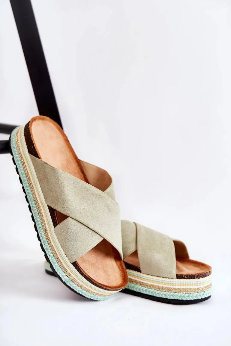 Klasyczne klapki damskie zostały wykonane z eko zamszu. Paski klapek krzyżują się na przodzie. Wkładka jest wykonana z eko zamszu. Klapki osadzone na platformie ozdobionej warkoczem z tkaniny i elementami z tworzywa sztucznego. Model z odkrytym noskiem. Profilowana wkładka zapewni wygodę podczas użytkowania. Koniecznie sprawdź pozostałe modele damskich klapek! Przy wyborze rozmiaru prosimy sugerować się tabelą rozmiarów.