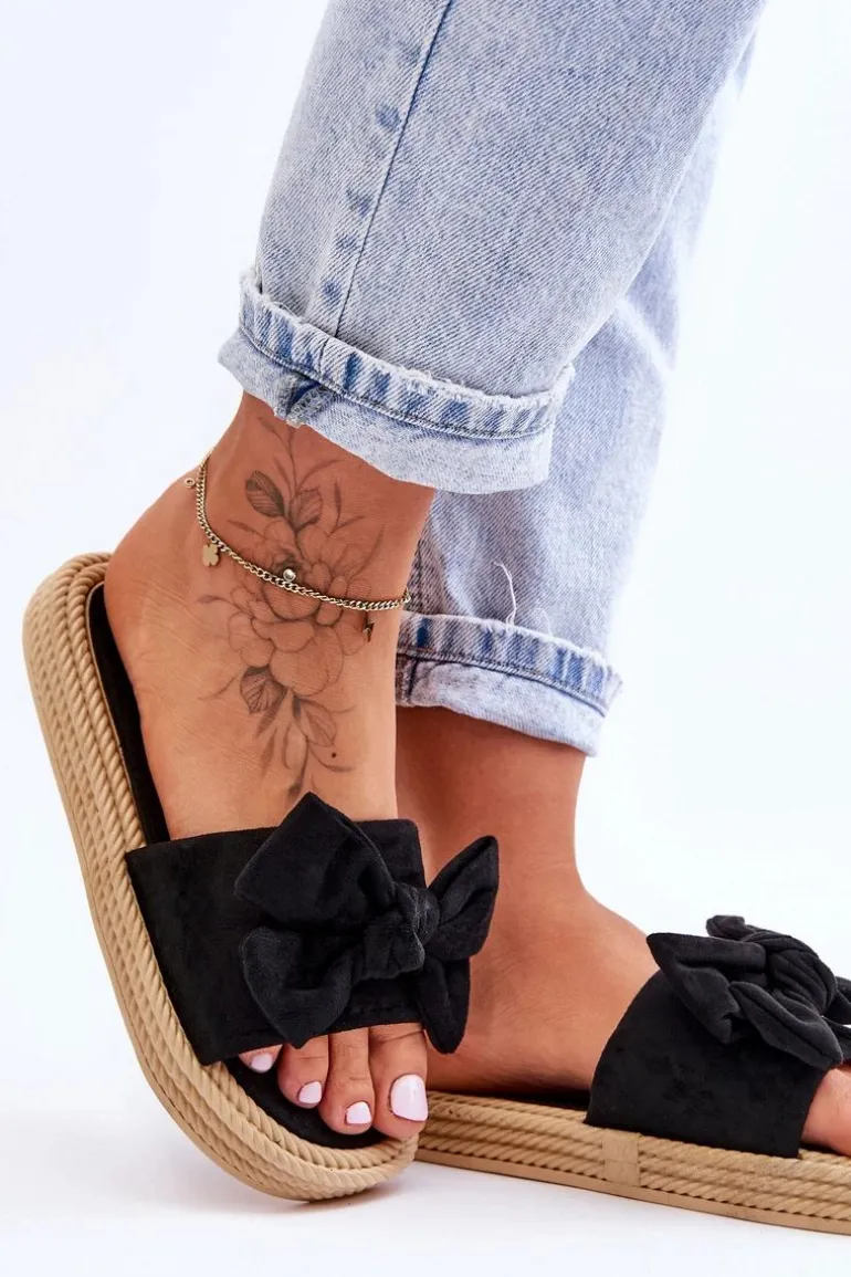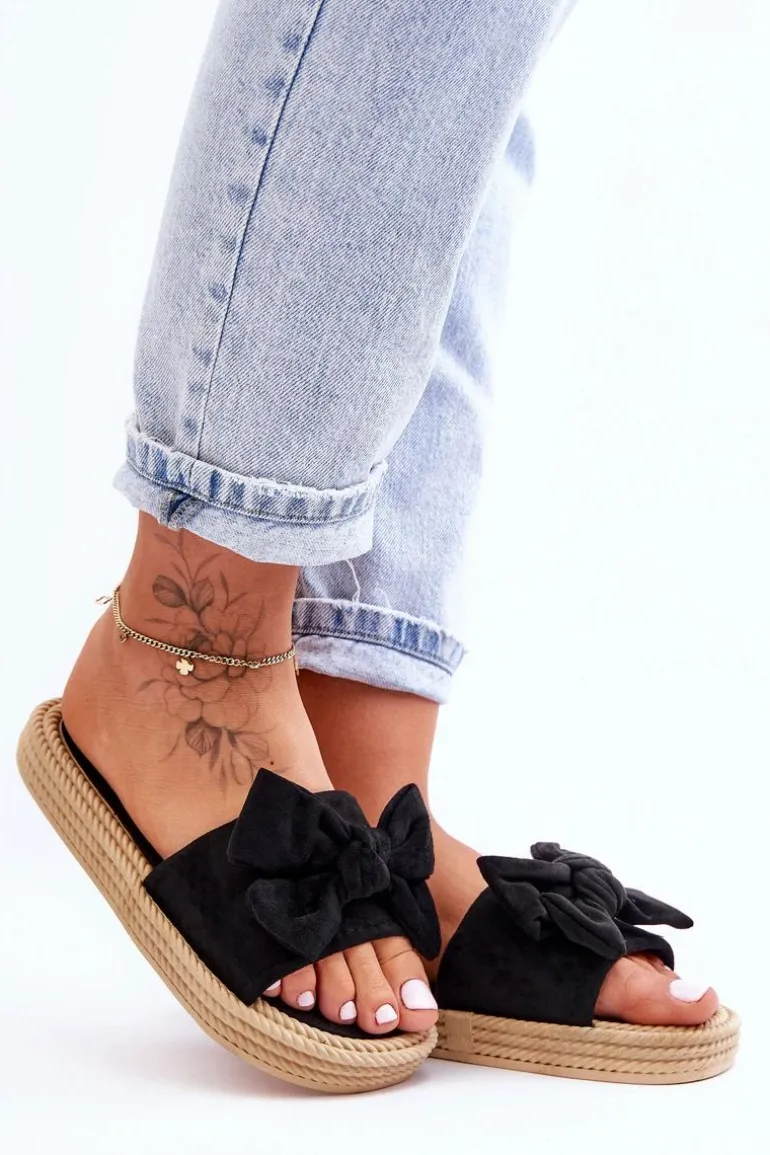 Damskie klapki zostały wykonane z eko zamszu. Model ten posiada uroczą kokardę na przodzie. Klapki osadzono na masywnej platformie. Model ten idealnie sprawdzi się na cieplejsze dni! Wkładka w tym obuwiu także jest wykonana z eko zamszu. Nie czekaj dłużej i kup już dziś! Przy wyborze rozmiaru prosimy sugerować się tabelą rozmiarów.