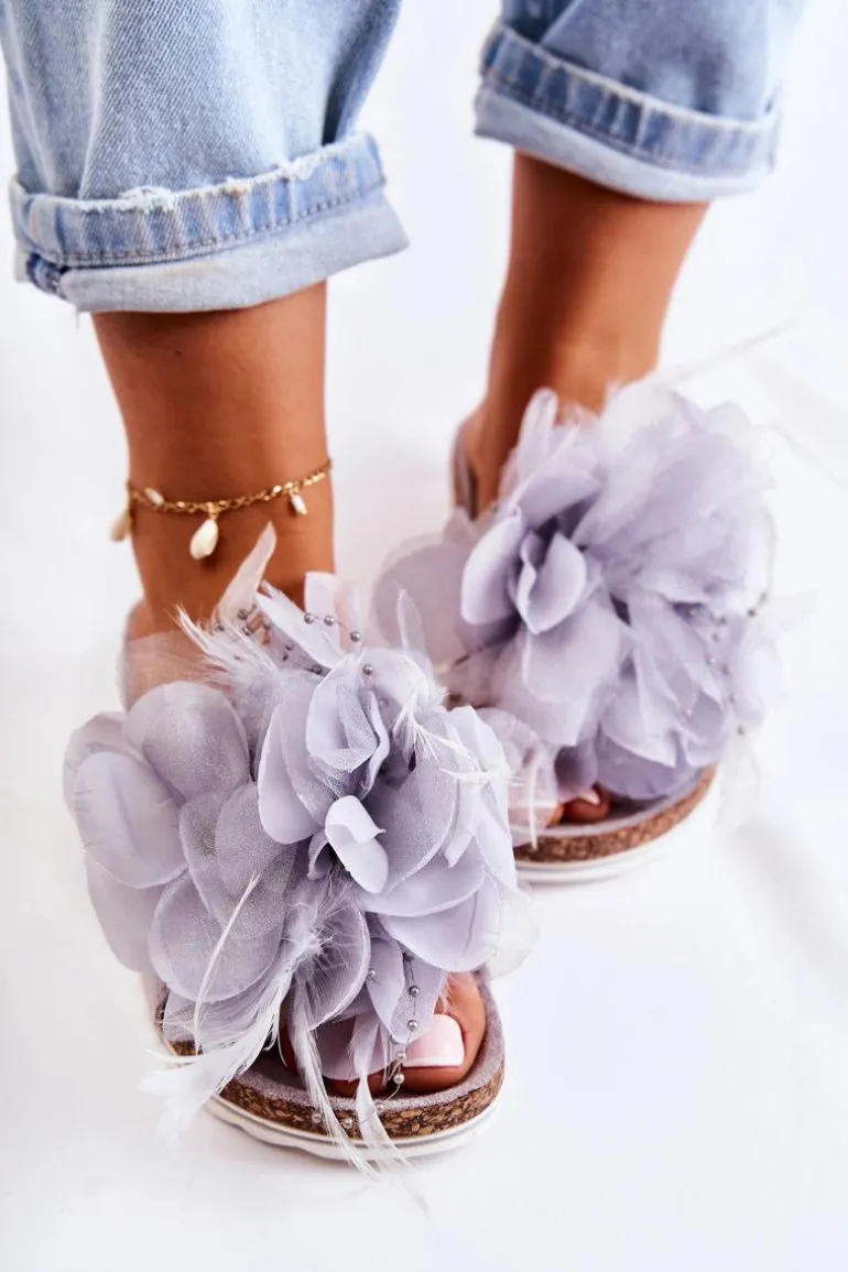 Klasyczne damskie klapki z wyjątkową ozdobą na przodzie będą idealnym obuwiem dla osób, które uwielbiają wyróżniać się wśród tłumu! Ozdoba wykonana z tkaniny, z piórkami oraz ozdobnymi koralikami. Klapki są wykonane z eko zamszu. Osadzone na masywnej platformie wykonanej z korka oraz tworzywa sztucznego. Profilowana wkładka jest wygodna w użytkowaniu. Model wsuwany. Przy wyborze rozmiaru prosimy sugerować się tabelą rozmiarów.
