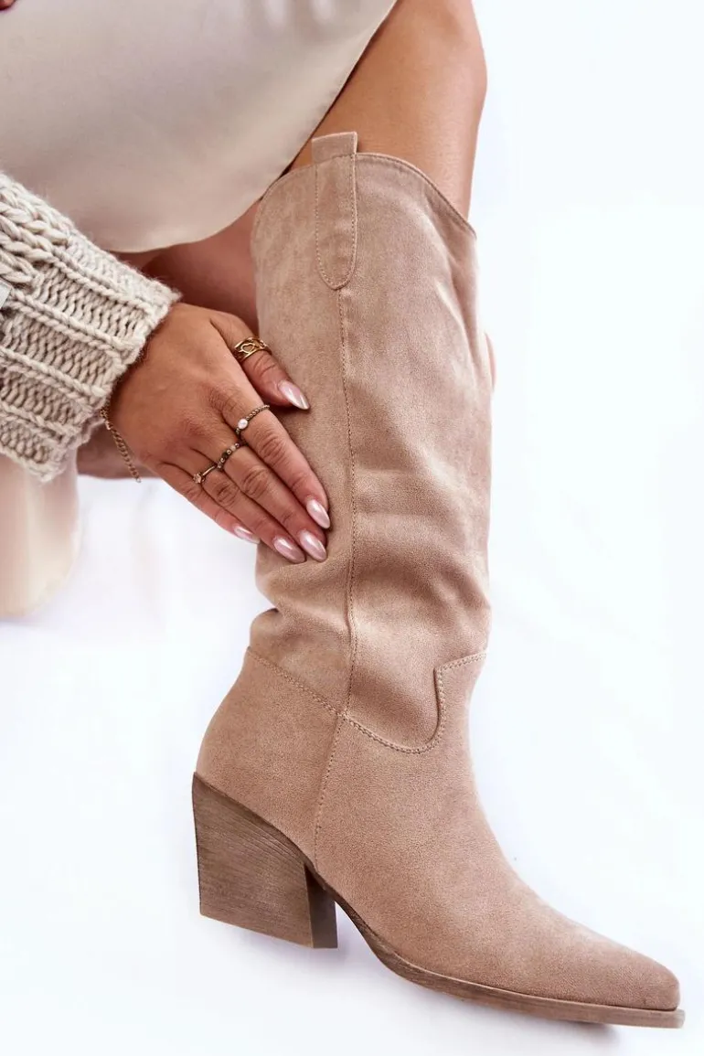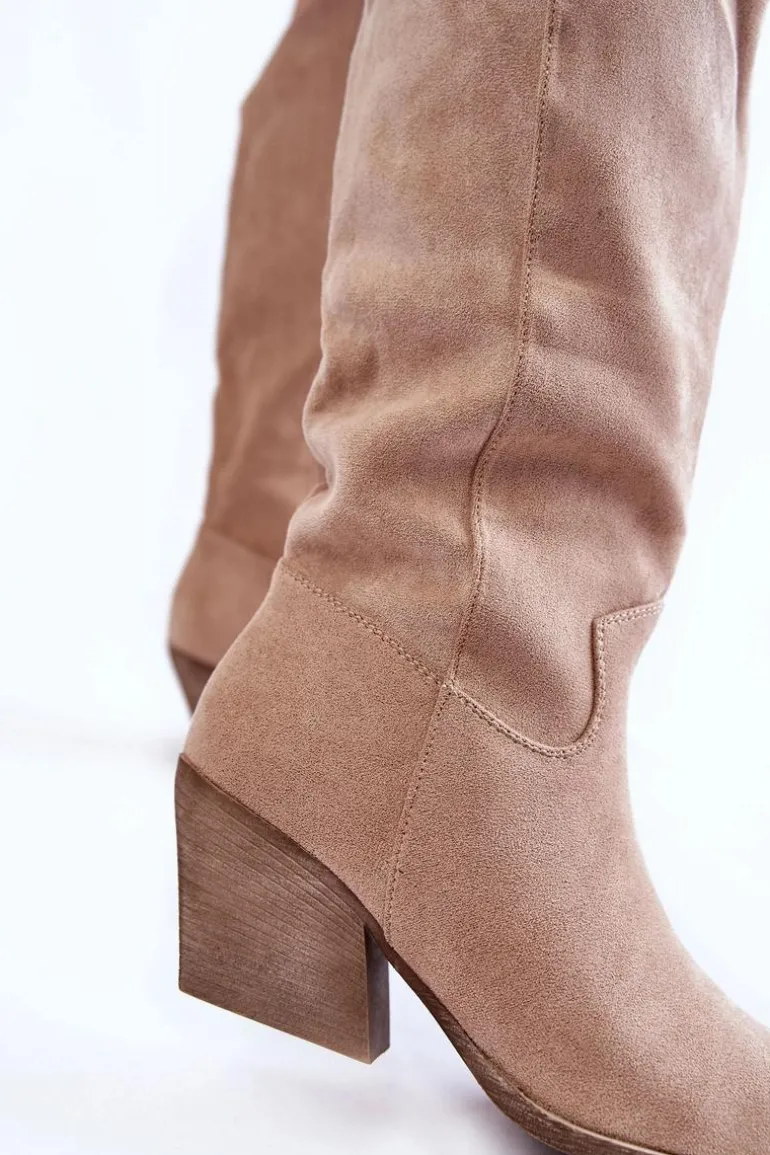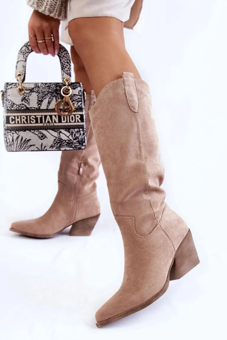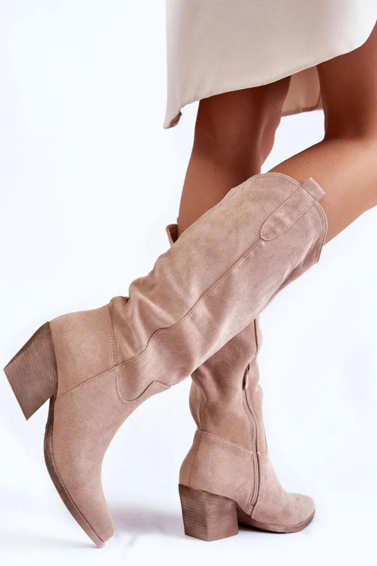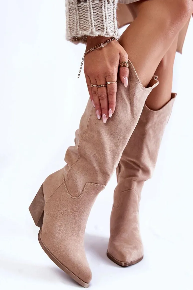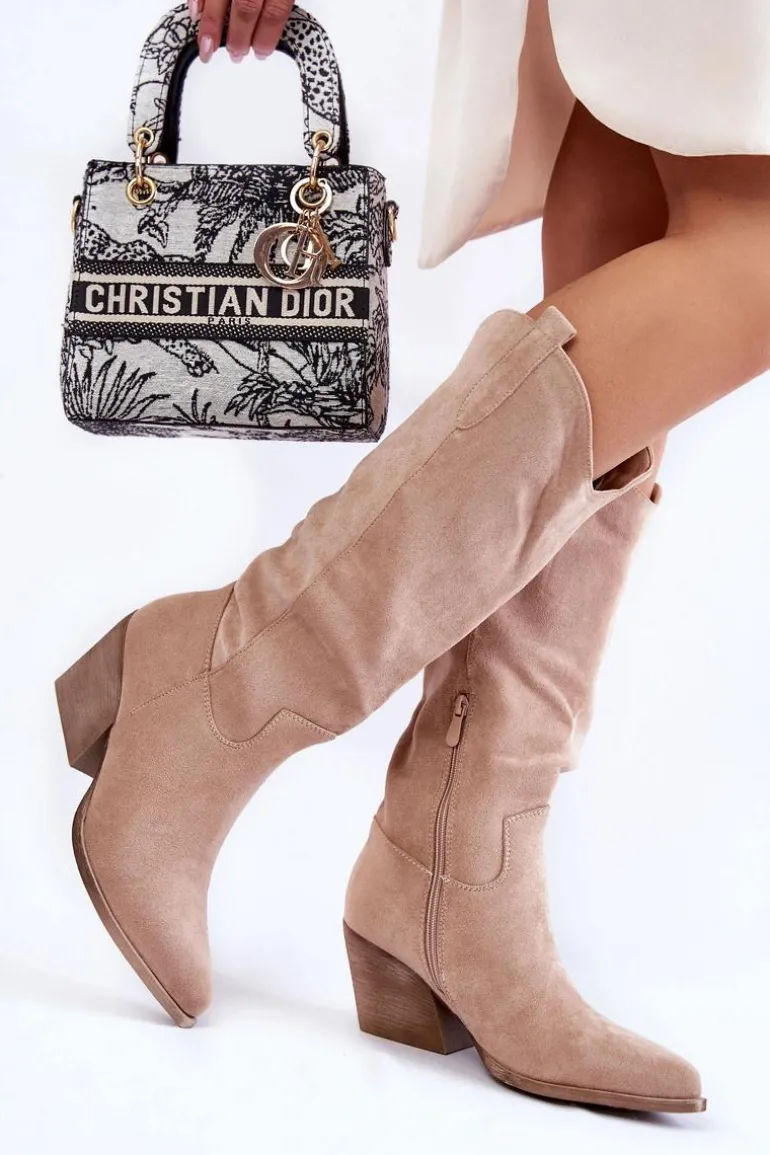 Modne kozaki-kowbojki uzupełnią wiele Twoich jesiennych stylizacji! Model wykonany z miłego eko zamszu. Kozaki są wsuwane, a także posiadają zamek z boku cholewki. Osadzone na obcasie w postaci masywnego słupka. Ocieplone wewnątrz kocem obuwniczym. Nosek w szpic optycznie wysmukli nogi. Kozaki posiadają usztywniany zapiętek. Przy wyborze rozmiaru prosimy sugerować się tabelą rozmiarów.