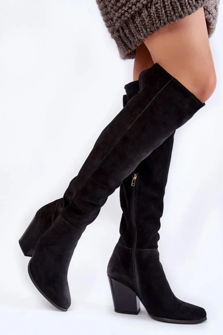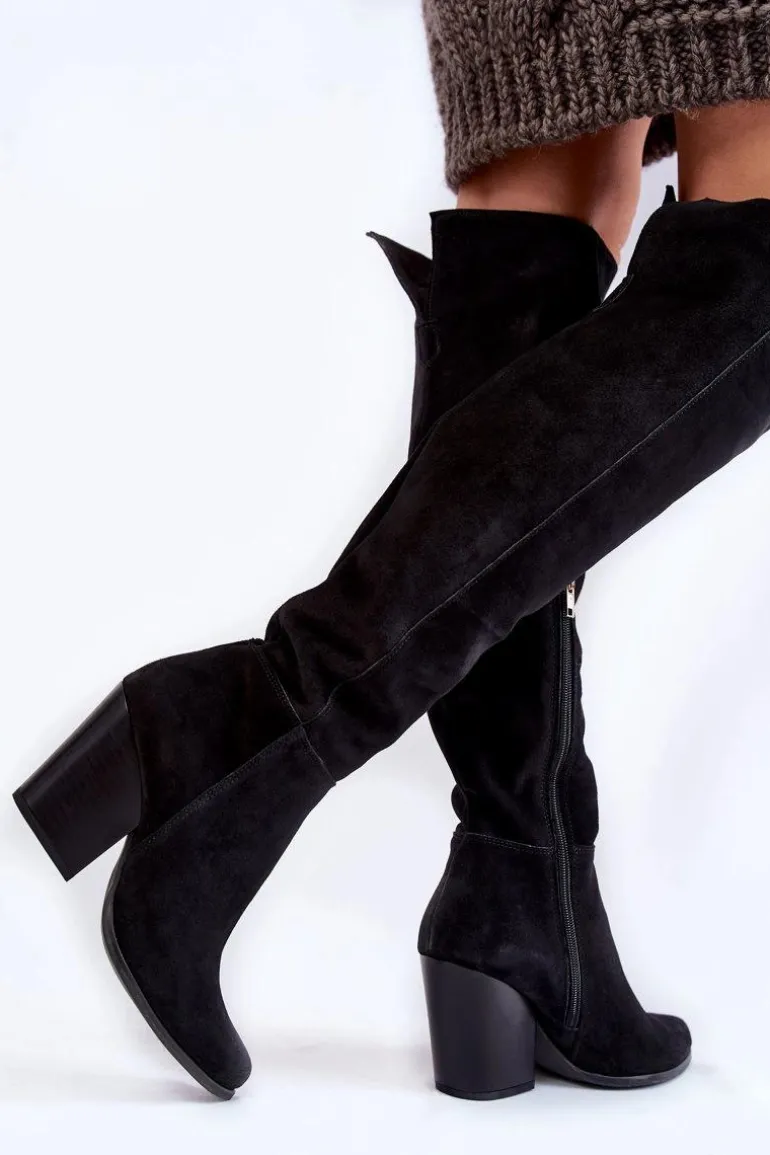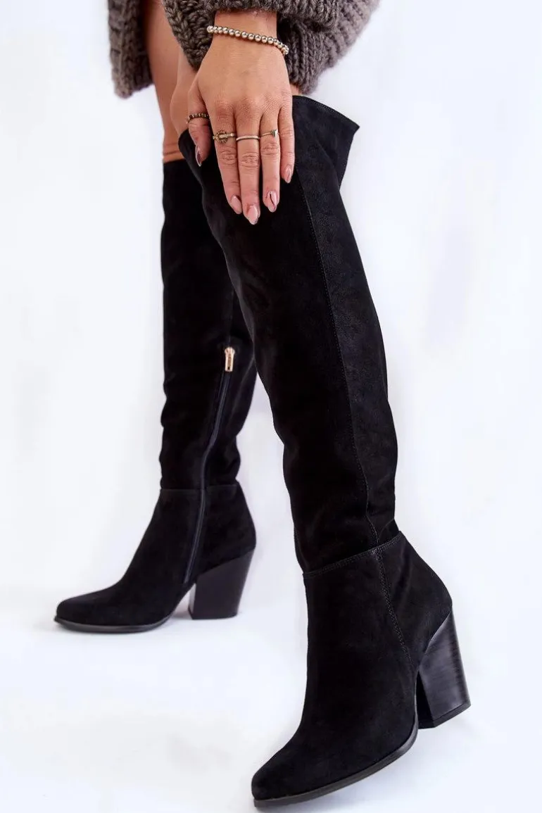 Wyjątkowe kozaki damskie o fasonie muszkieterek. Wysoka cholewka za kolano jest wsuwana i dodatkowo zamykana na suwak. Zapiętek jest usztywniany, co zapewni stabilizację stopy. Model wykonany ze skór wysokiej jakości. Kozaki te zostały wewnątrz ocieplone kocem obuwniczym. Miękka wkładka zapewni komfort podczas użytkowania. Przy wyborze rozmiaru prosimy kierować tabelą rozmiarów.