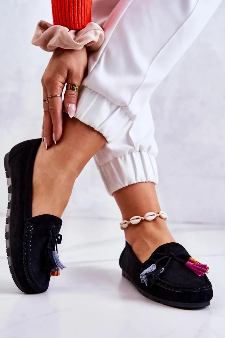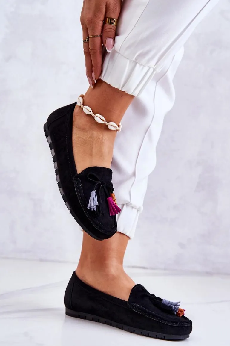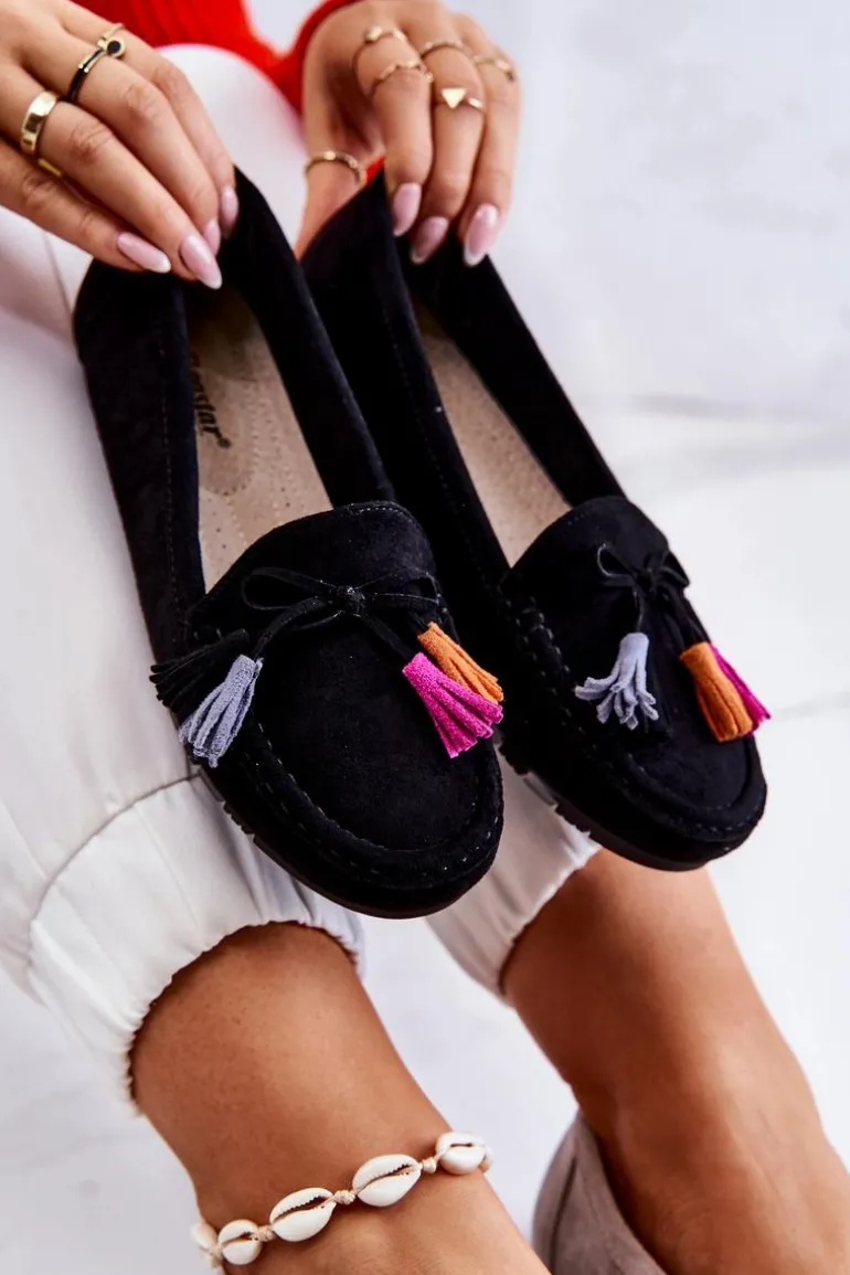 Świetne mokasyny damskie na ciepłe, pogodne dni! Wykonane z przyjemnego w dotyku eko zamszu. Posiadają usztywniany zapiętek. Z przodu znajdują się ozdobne, eko zamszowe frędzle wraz z kokardą. Nosek zakryty, okrągły. Buty posiadają miękką, perforowaną wkładkę, która została wykonana ze skóry. Mokasyny posiadają elastyczną, wykonaną z gumowego tworzywa podeszwę. Idealne do pracy czy na weekendowy wyjazd ze znajomymi. Model o uniwersalnym fasonie, z którym skomponujesz wiele stylizacji! Przy wyborze rozmiaru prosimy sugerować się tabelą rozmiarów.
