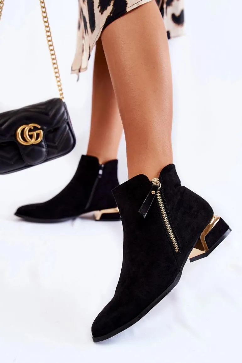 Botki damskie zostały wykonane z eko skórzanych materiałów. Posiadają nosek w szpic oraz ozdobny suwak po zewnętrznej stronie. Botki zostały ocieplone wewnątrz miłym w dotyku kocem obuwniczym. Osadzone na płaskim obcasie ozdobionym lustrzanym elementem. Zapiętek jest usztywniany. Zakładanie ułatwi wszyty suwak po wewnętrznej stronie. Przy wyborze rozmiaru prosimy sugerować się tabelą rozmiarów.