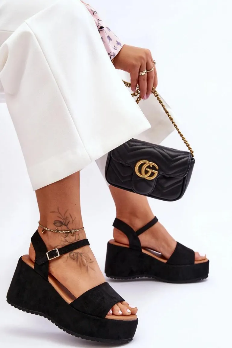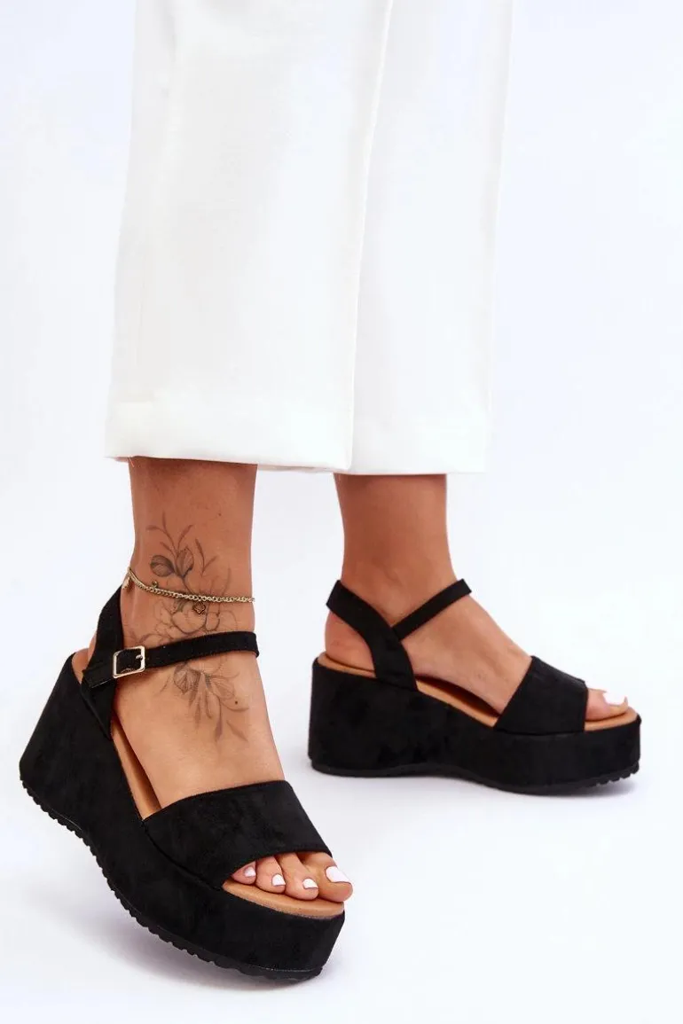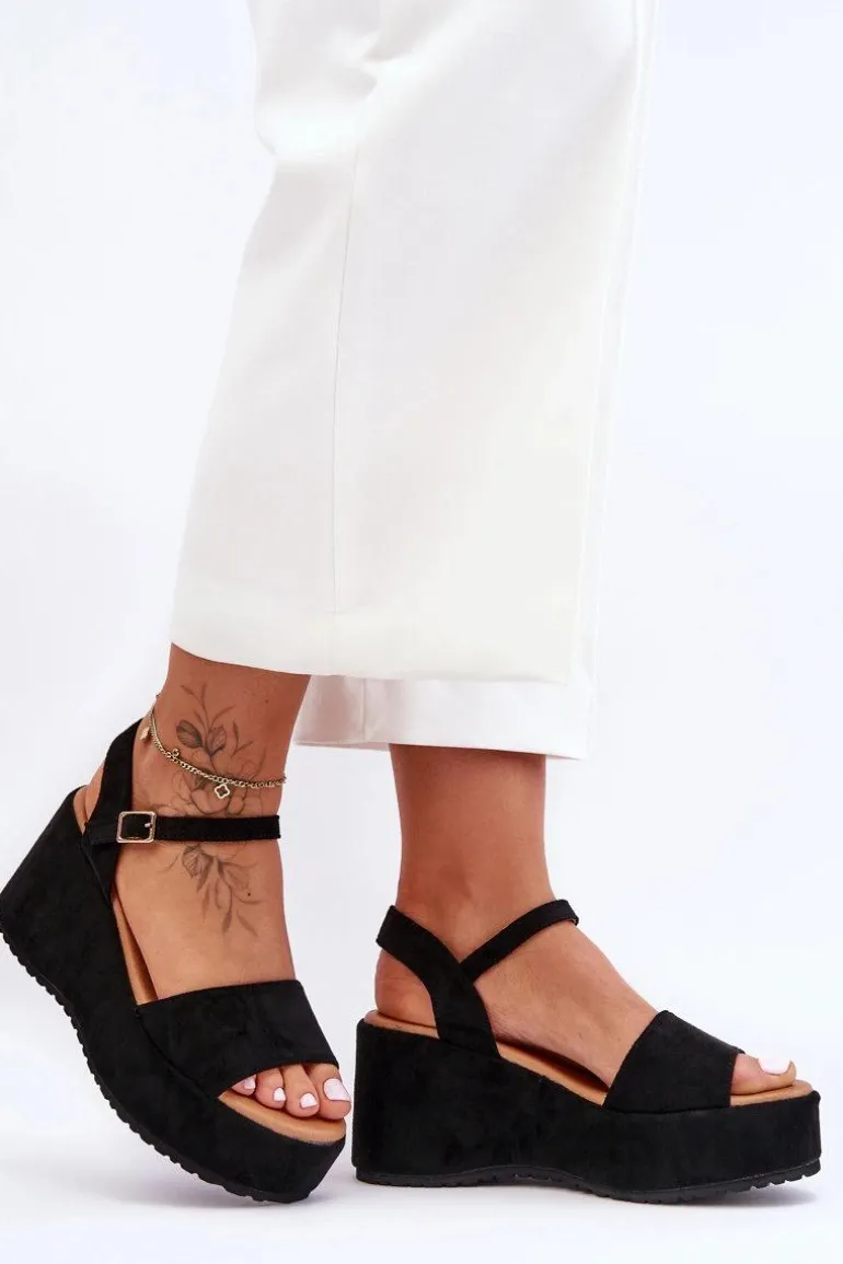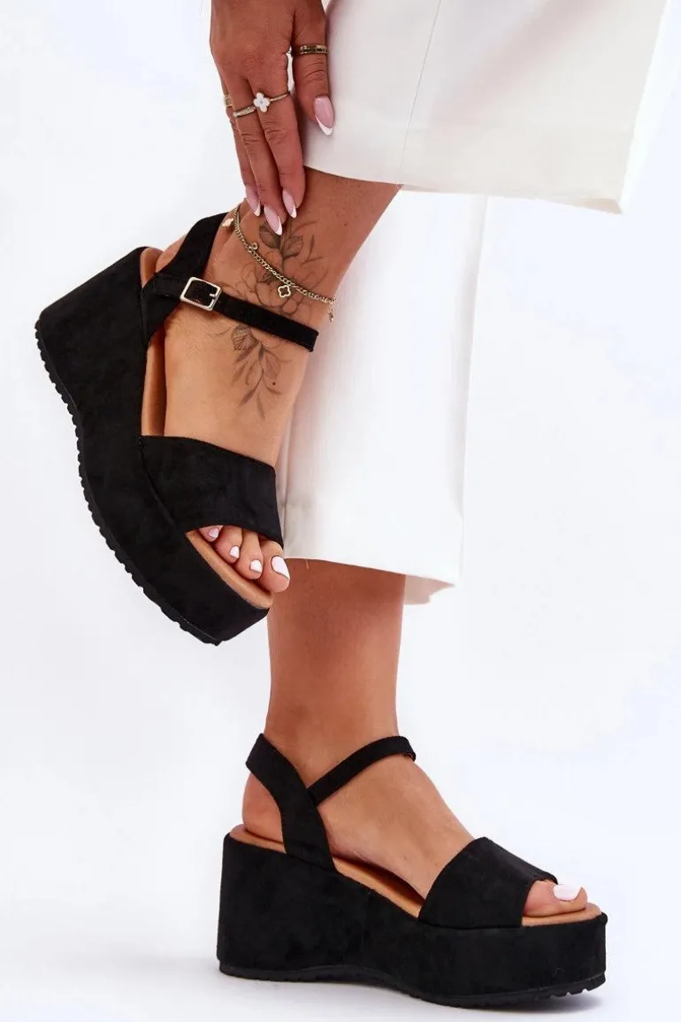 Damskie Zamszowe Sandałki Na Koturnie Czarne Lydia