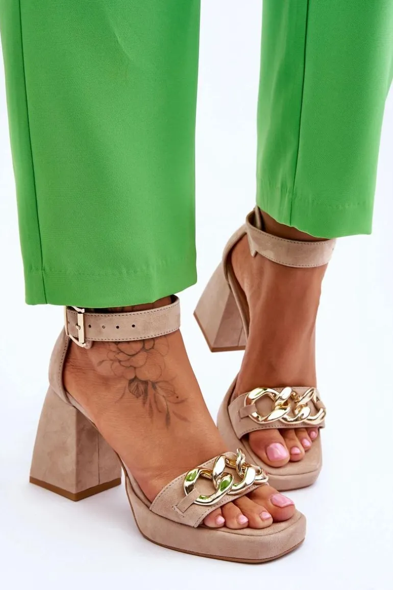 Wyjątkowe sandały damskie osadzone na masywnym, wyższym obcasie w postaci klocka oraz delikatnej platformie. Posiadają z przodu elegancki łańcuch z tworzywa sztucznego. Miękka wkładka ze skóry naturalnej zapewni komfort podczas użytkowania. Zapiętek jest usztywniany. Dodatkowo model ten posiada usztywniany zapiętek. Sandałki są zapinane na regulowany pasek ze sprzączką.Przy wyborze rozmiaru prosimy sugerować się tabelą rozmiarów.