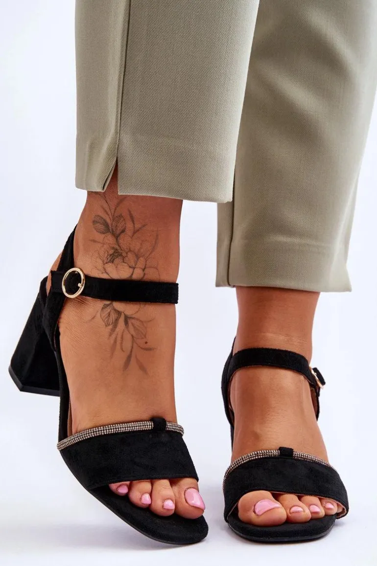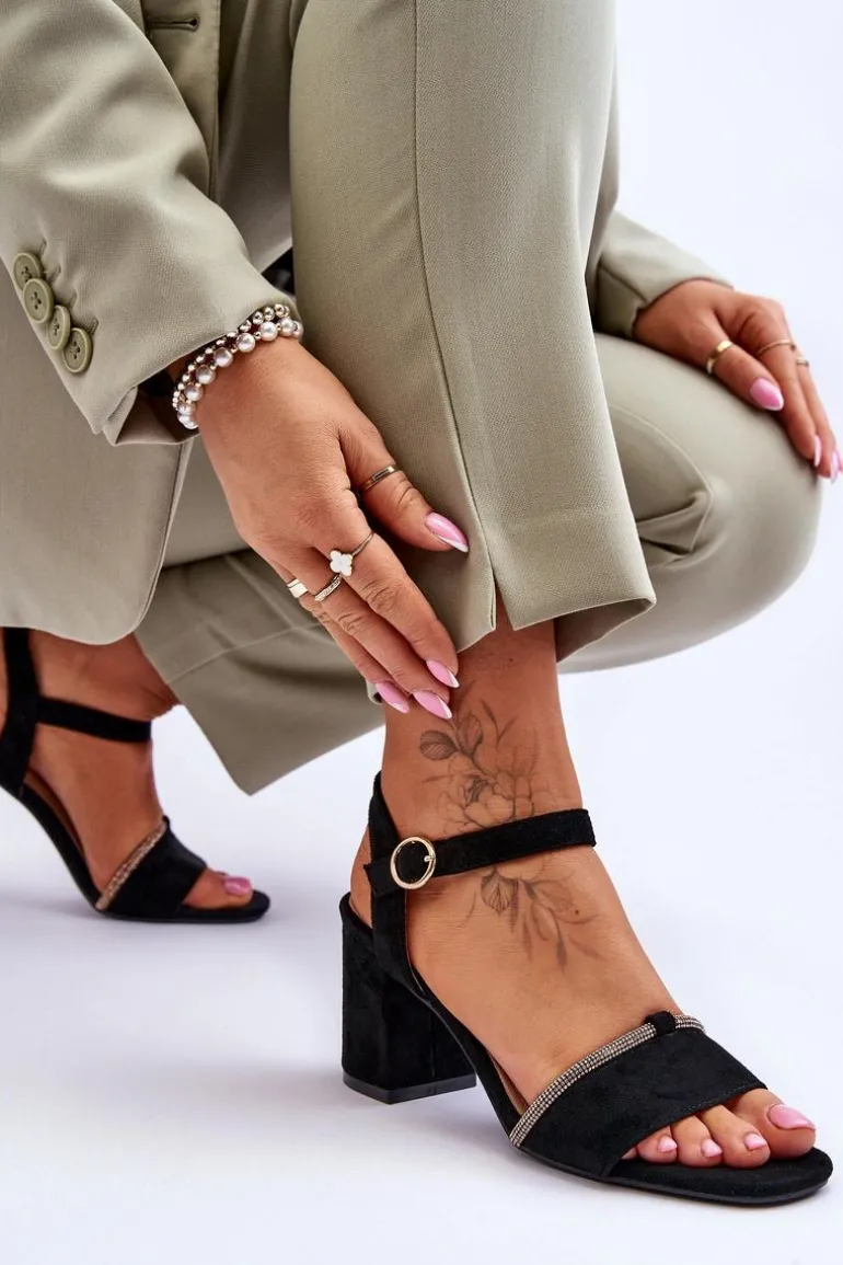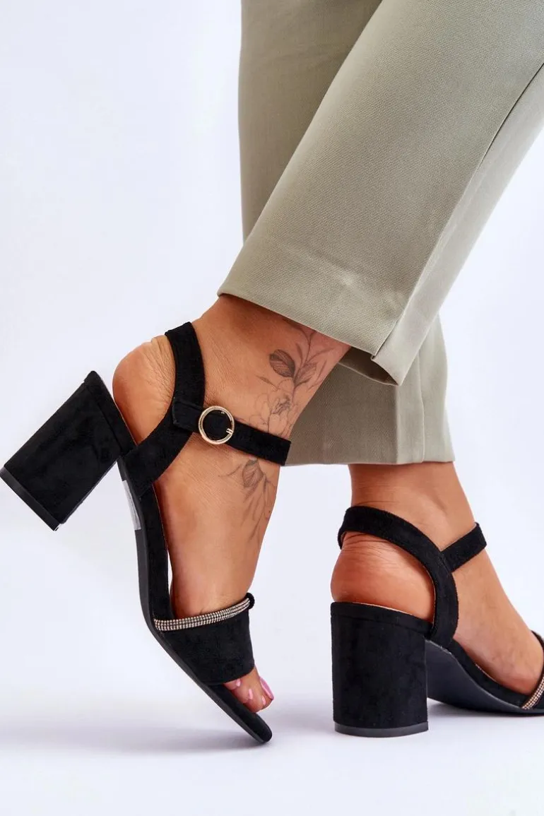 Damskie sandałki na obcasie w postaci słupka. Model ten został wykonany z miłego w dotyku eko zamszu. Sandałki zapinane na regulowany pasek ze sprzączką. Wkładka została wykonana z naturalnej skóry. Jest niezwykle miękka i wygodna w użytkowaniu. Koniecznie powinnaś je mieć! Przy wyborze rozmiaru prosimy sugerować się tabelą rozmiarów.
