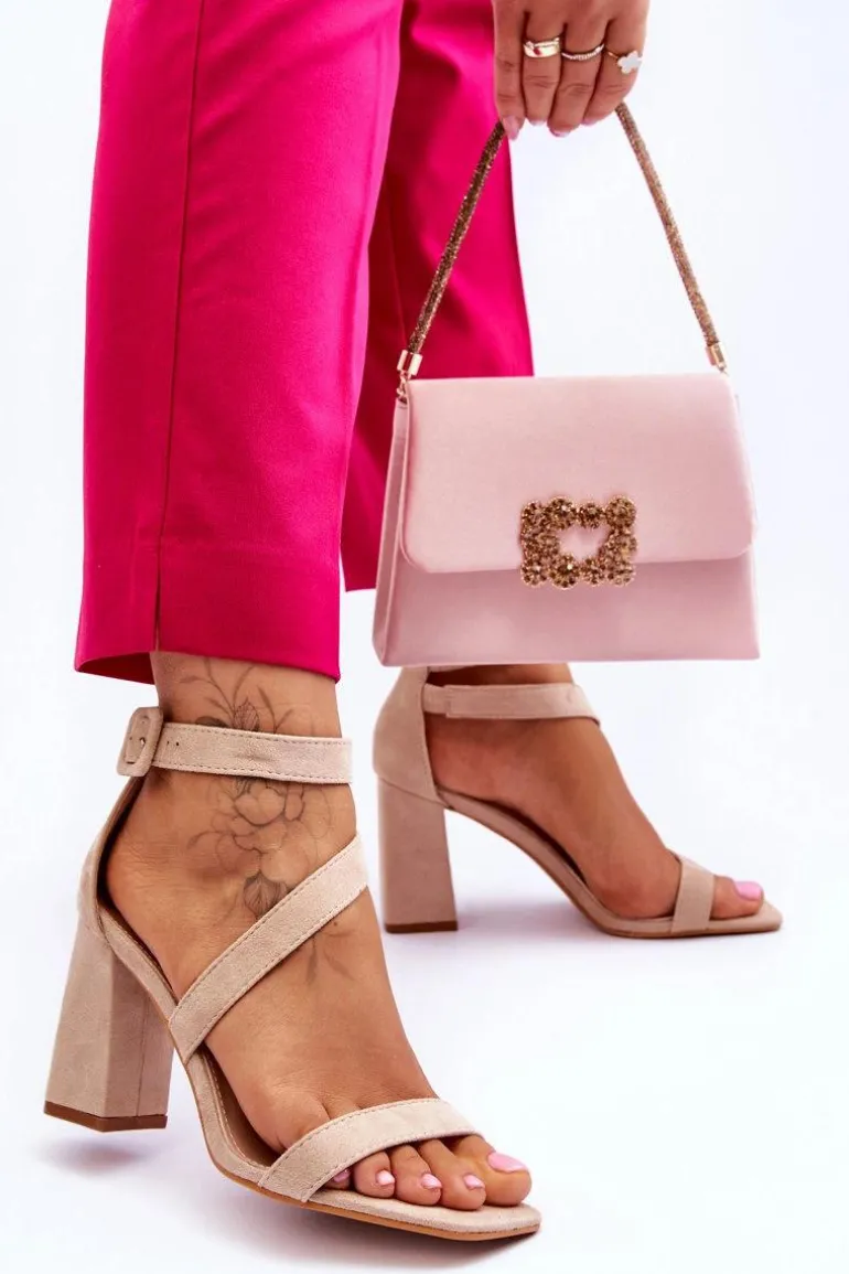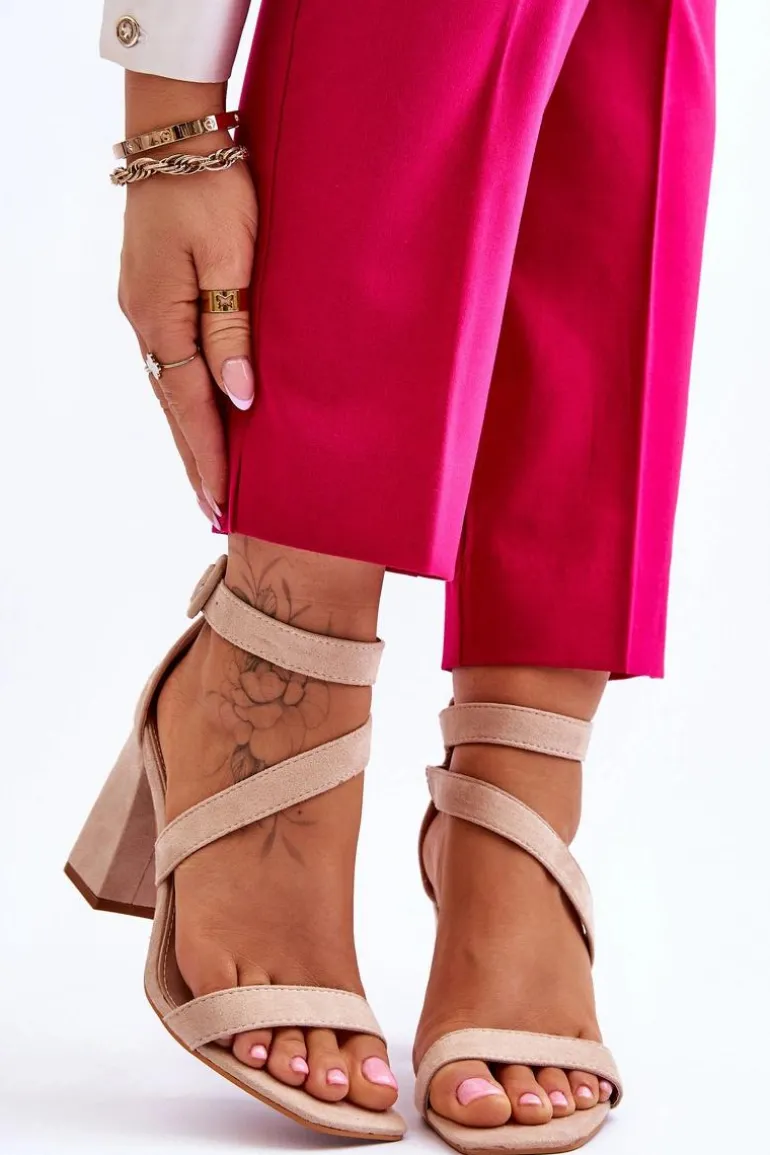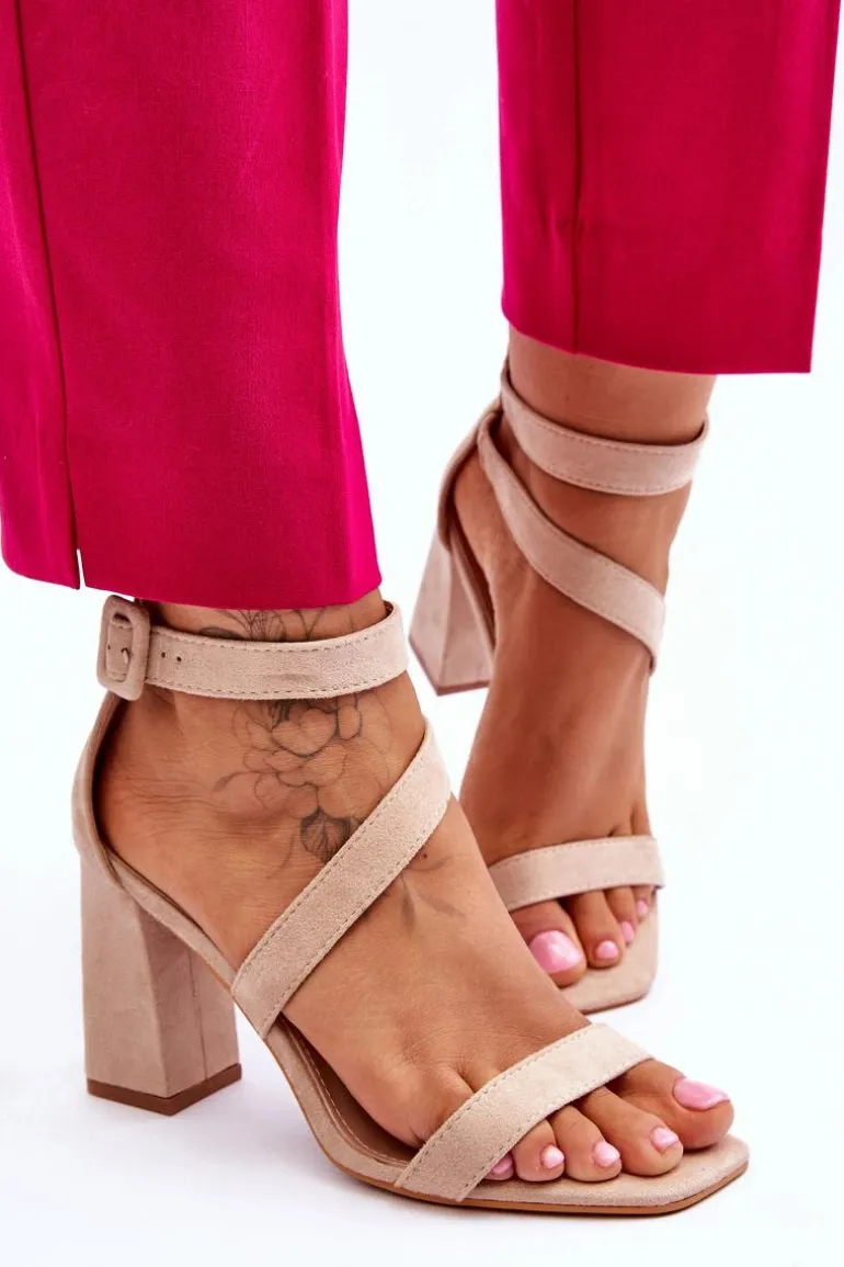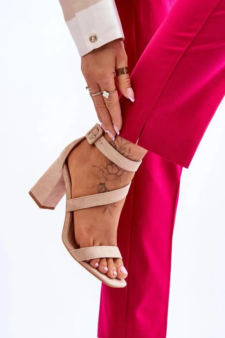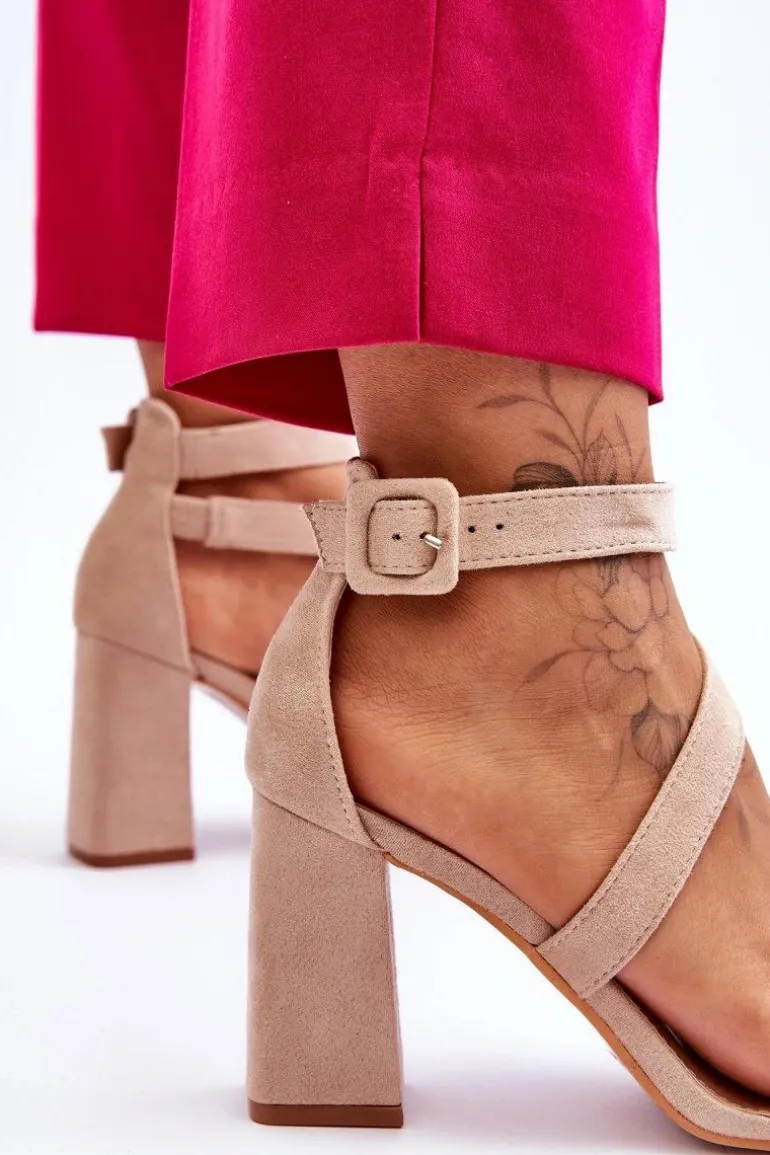 Modne sandałki damskie na obcasie w postaci słupka. Wykonane z eko zamszu z dodatkowym paseczkiem przechodzącym przez środek obuwia. Zapinane wokół kostki na regulowany pasek ze sprzączką. Wkładka z eko skóry jest miękka i wygodna w użytkowaniu. Buty te świetnie sprawdzą się w upalne dni podczas randki, uroczystości czy ważnego spotkania. Przy wyborze rozmiaru prosimy sugerować się tabelą rozmiarów.