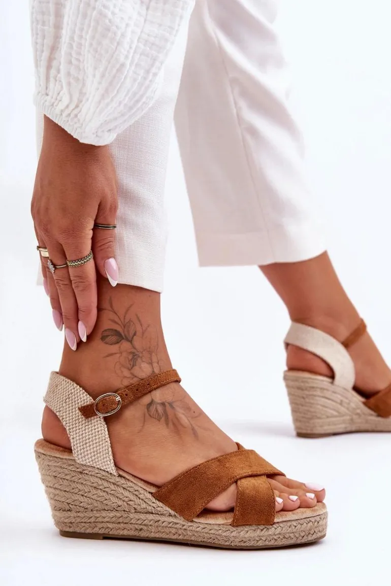Klasyczne sandały na modnym, plecionym koturnie i platformie zostały wykonane z połączenia tkaniny oraz eko zamszu. Wkładka jest niezwykle miękka i wykonana także z eko zamszu. Buty posiadają zapięcie na regulowany pasek ze sprzączką. Podeszwa w tych sandałkach jest wykonana z tworzywa sztucznego. Przy wyborze rozmiaru prosimy sugerować się tabelą rozmiarów.