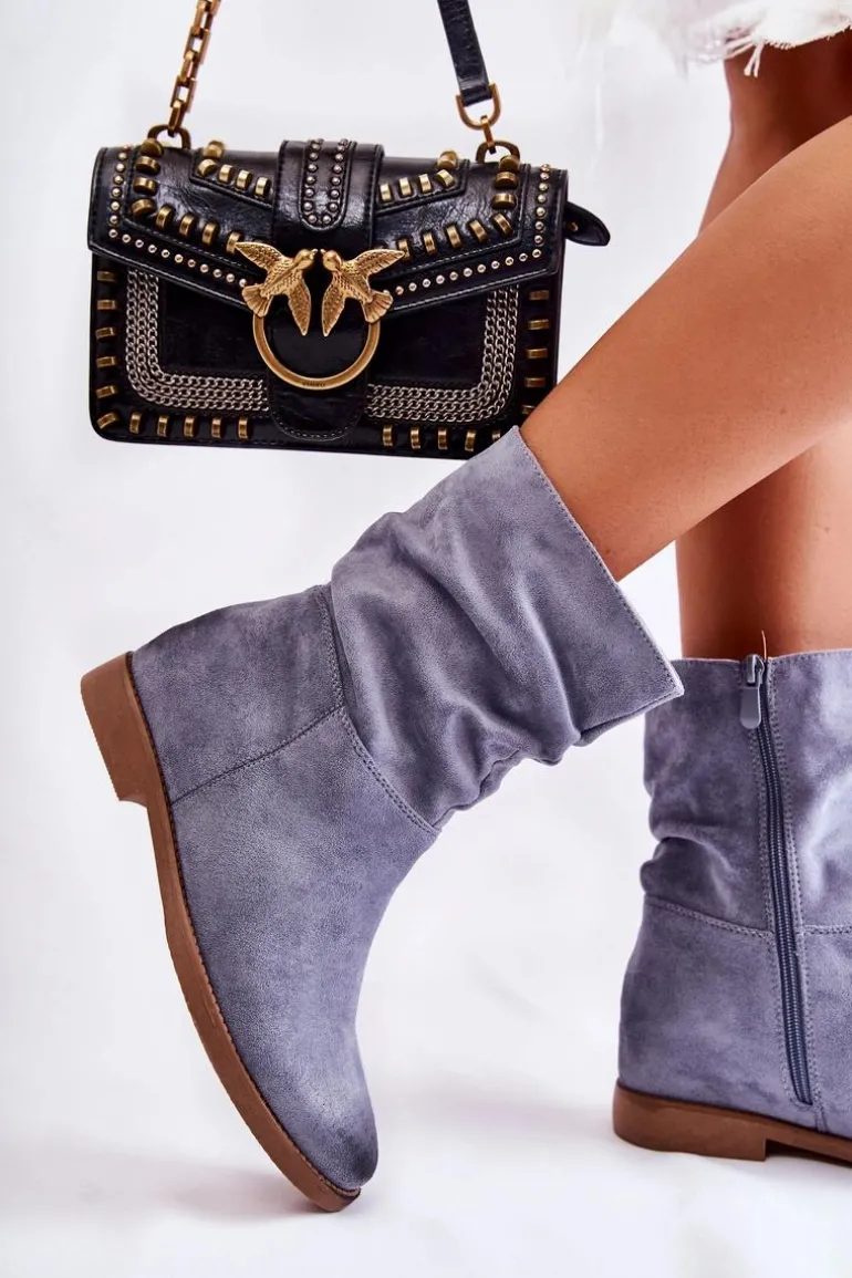 Botki damskie posiadają wysoką, lekko marszczoną cholewkę za kostkę. Zamykane na suwak. Wykonane z przyjemnego w dotyku eko zamszu. Wkładka została wykonana z tkaniny. Zapiętek usztywniany. Na nosku oraz z tyłu cholewki znajdują się modne przetarcia. Idealne na sezon wiosenno-jesienny. Model ten będzie świetnie prezentował się z jeansami czy zwiewną spódnicą. Przy wyborze rozmiaru prosimy sugerować się tabelą rozmiarów.