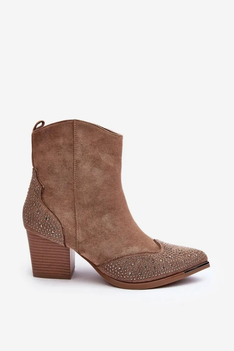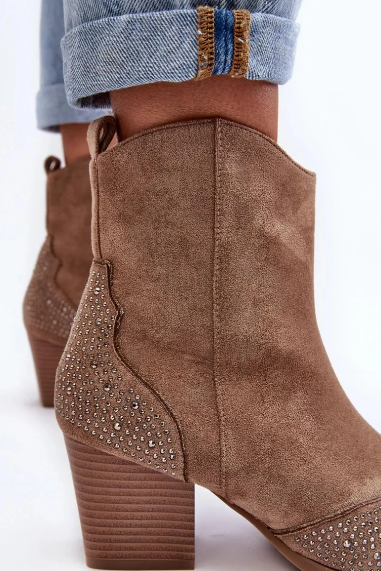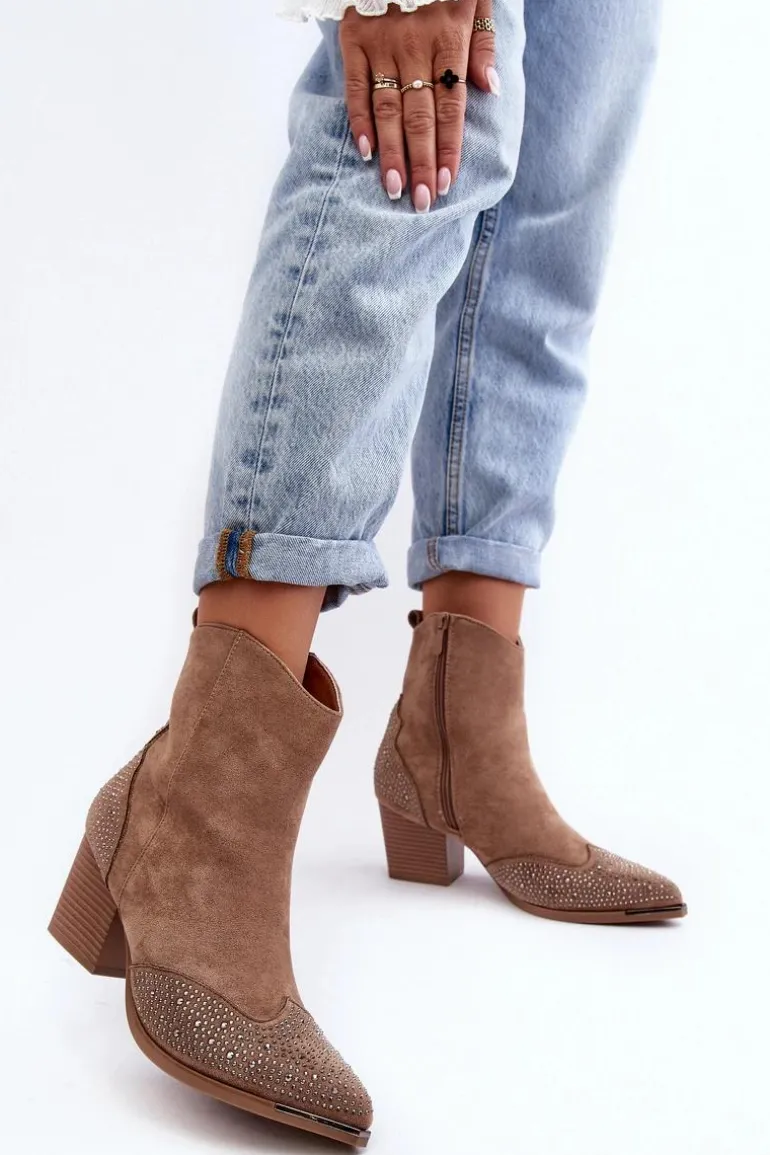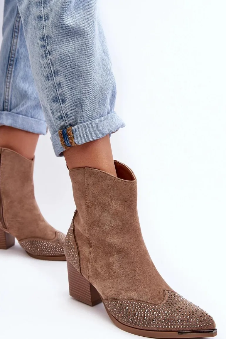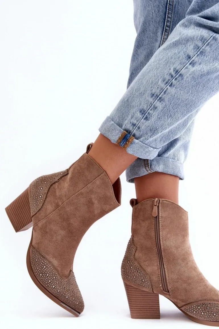 Botki w stylu kowbojek wykonane z eko zamszu. Osadzone na obcasie w postaci słupka. Noski w szpic optycznie wysmuklą nogi. Cholewka ozdobiona małymi dżetami. Środek ocieplony kocem obuwniczym. Model zapinany na suwak. Przy wyborze rozmiaru prosimy sugerować się tabelą rozmiarów.