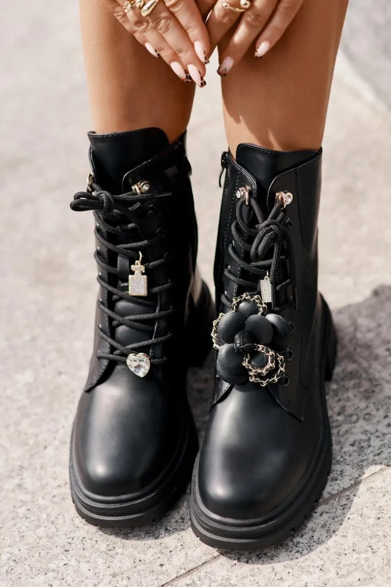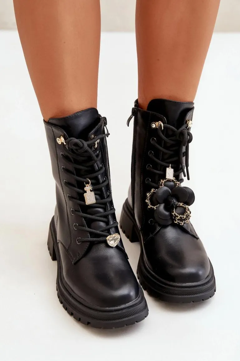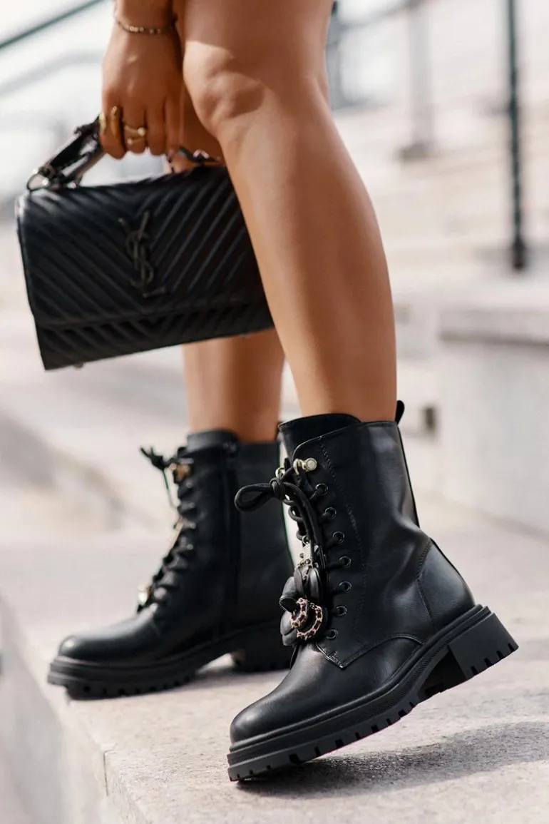 Damskie botki wykonane z ekologicznej skóry. Osadzone na płaskim obcasie. Noski zaokrąglone. Zapinane na suwak z boku dla łatwego zakładania, a dodatkowe sznurowanie z uroczymi przypinkami dodaje im wyjątkowego uroku. Idealne na jesienne i zimowe stylizacje, świetnie komponują się z różnymi zestawami na chłodniejsze dni. Przy wyborze rozmiaru prosimy sugerować się tabelą rozmiarów.